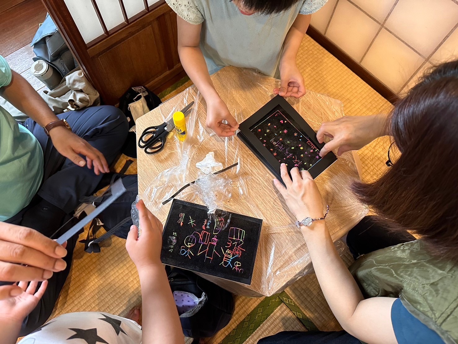 刮畫顧名思義就是透過「刮」的手法,來完成繪畫。不同於一般的繪畫紙張,刮畫紙整張紙被黑墨蓋住,而黑墨的底層則是色彩斑斕之色塊。透過竹籤作為畫筆,將表層的油墨刮除,則可呈現如同煙花般的絢爛效果。
