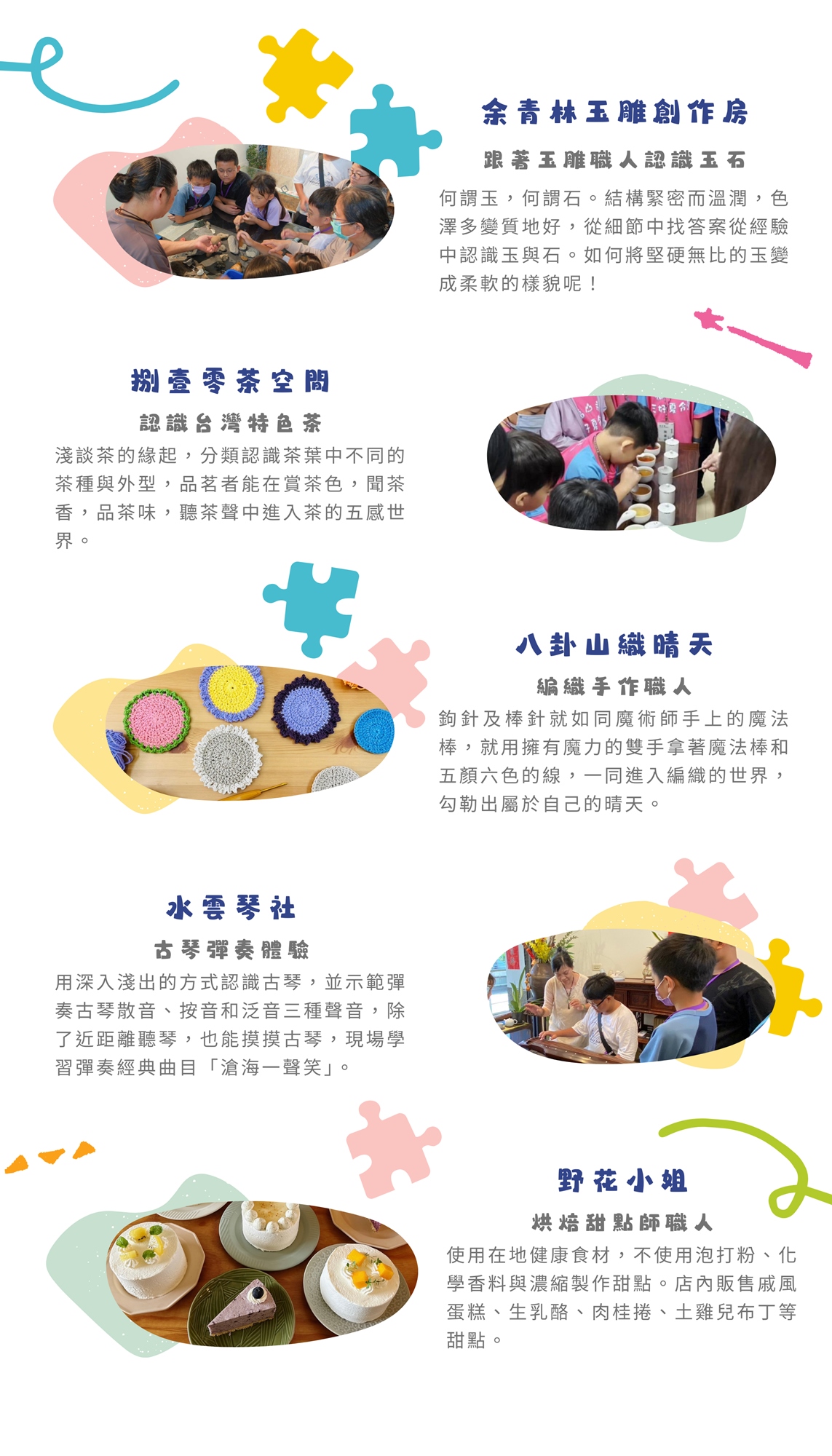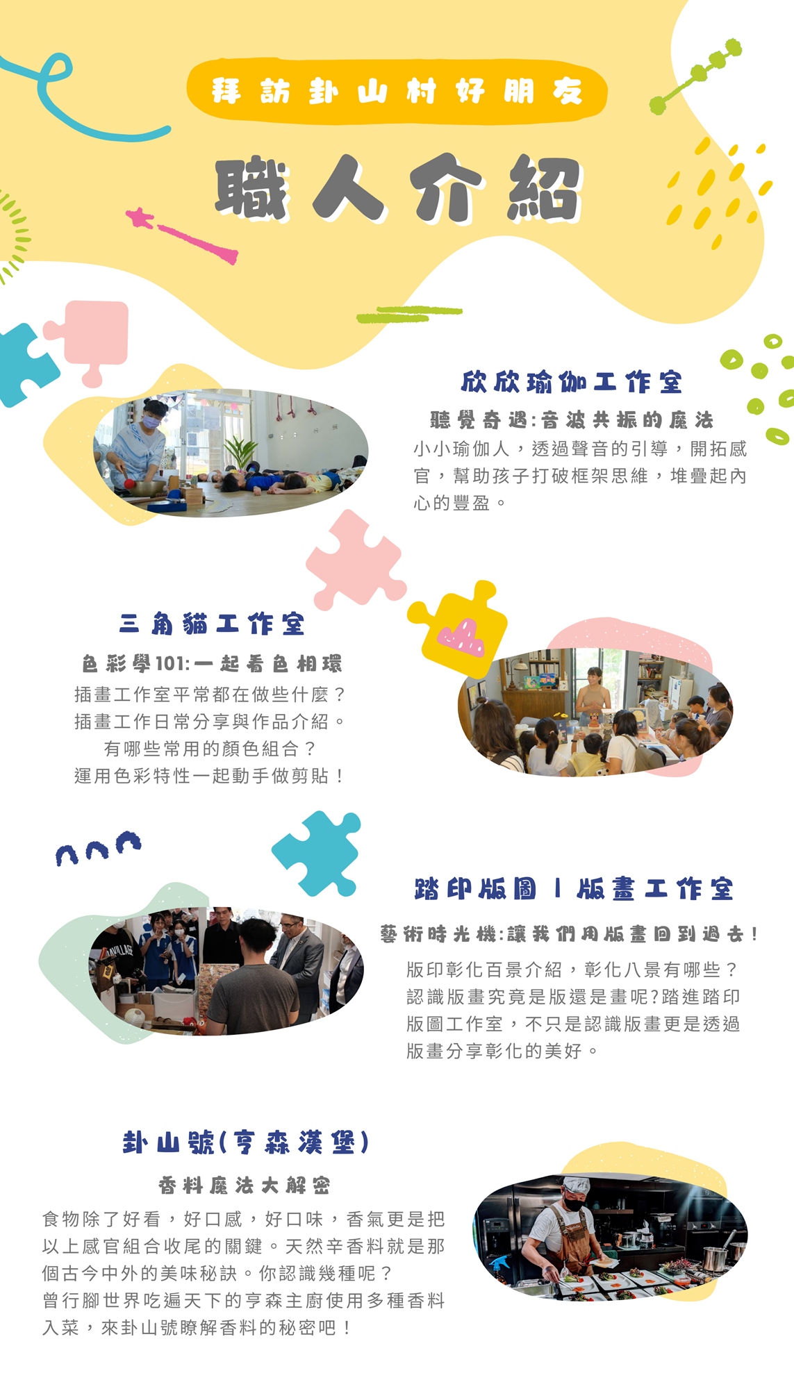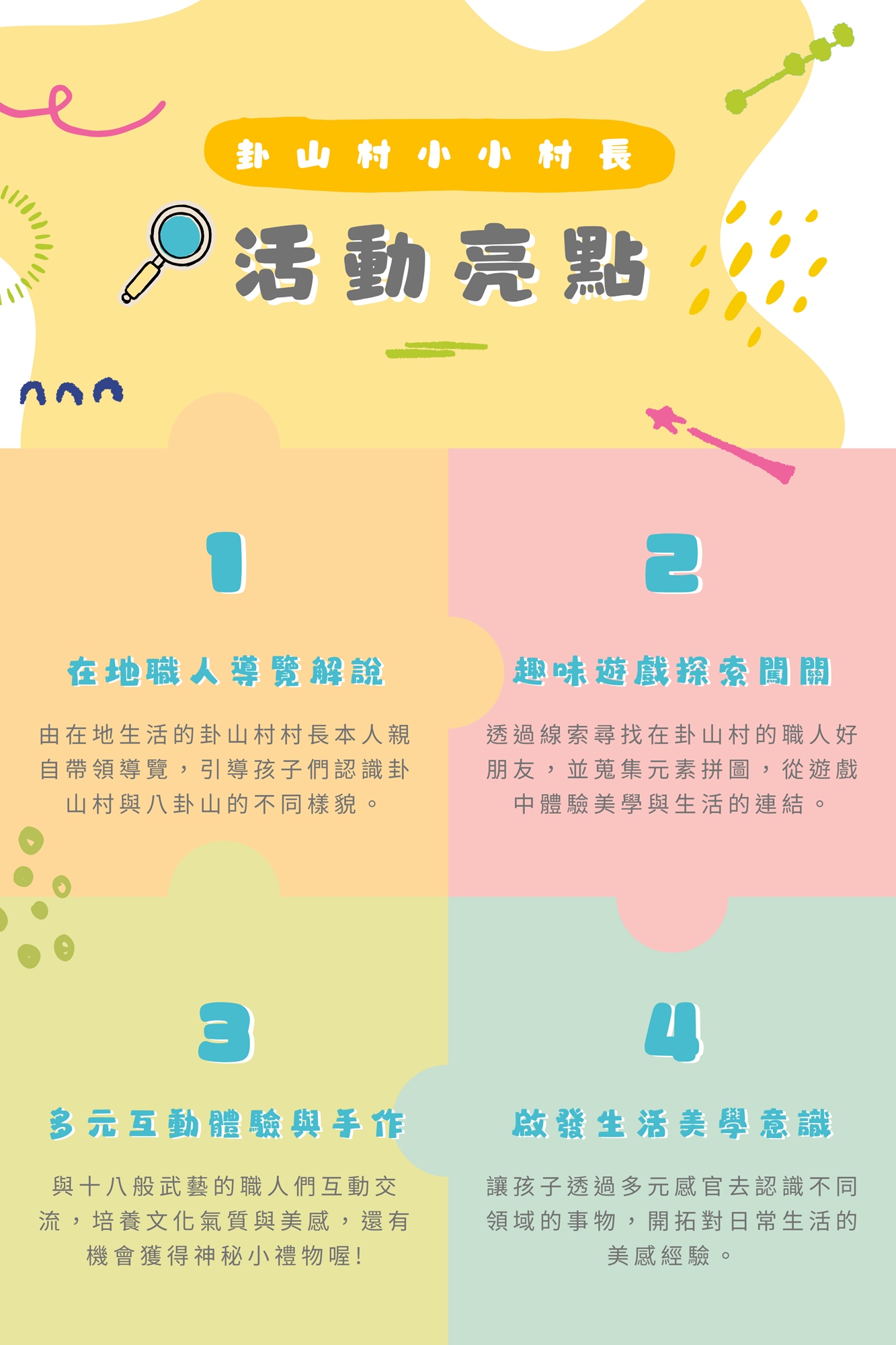 與卦山村中十八般武藝的職人們互動交流,培養孩子的文化氣質與美感,還有機會獲得神秘小禮物喔!