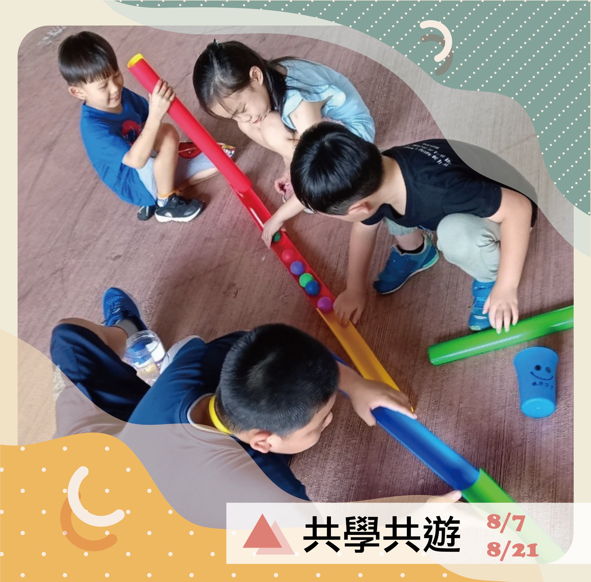 做完手作,就是「共遊」時間。我們安排了兩名成人助教、兩名中高年級大孩助教,作為孩子的「好玩伴」。除了是「好玩·伴」,也很自豪地跟大家說——他們是「好·玩伴」。他們很好玩,也很會陪伴。我們營造混齡的現場,給予孩子更多元的遊玩刺激。