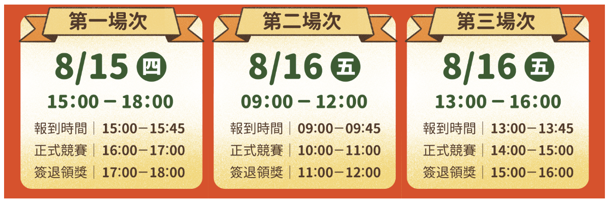 ※ 請參賽者在「報到時間」內抵達會場並完成簽到。若有超過報到時間未完成簽到者不予參賽。現場報名者亦同,報到順序以網路報名者優先。