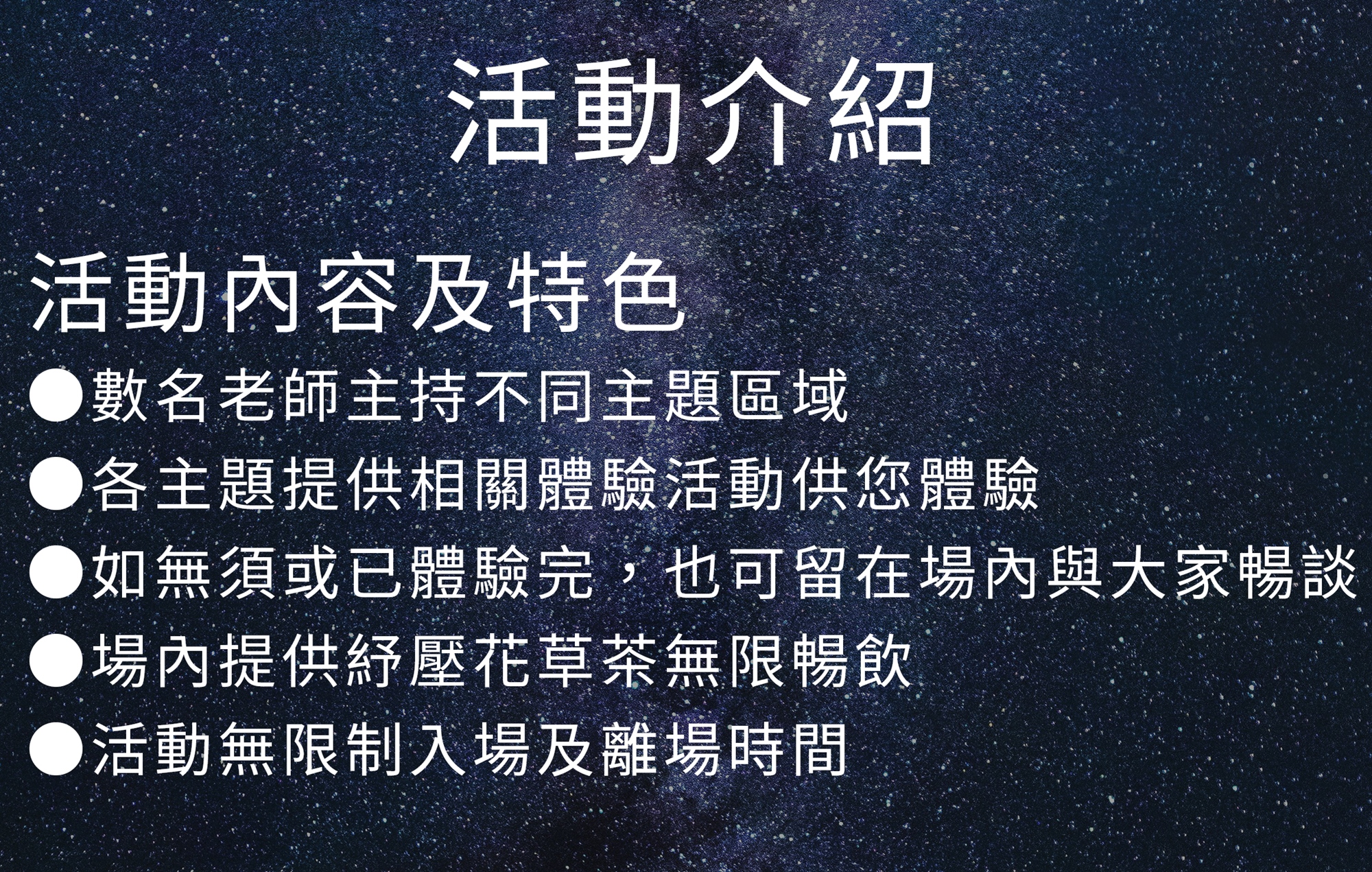 您可以在活動期間內自由體驗您有興趣的主題,放鬆的體驗,