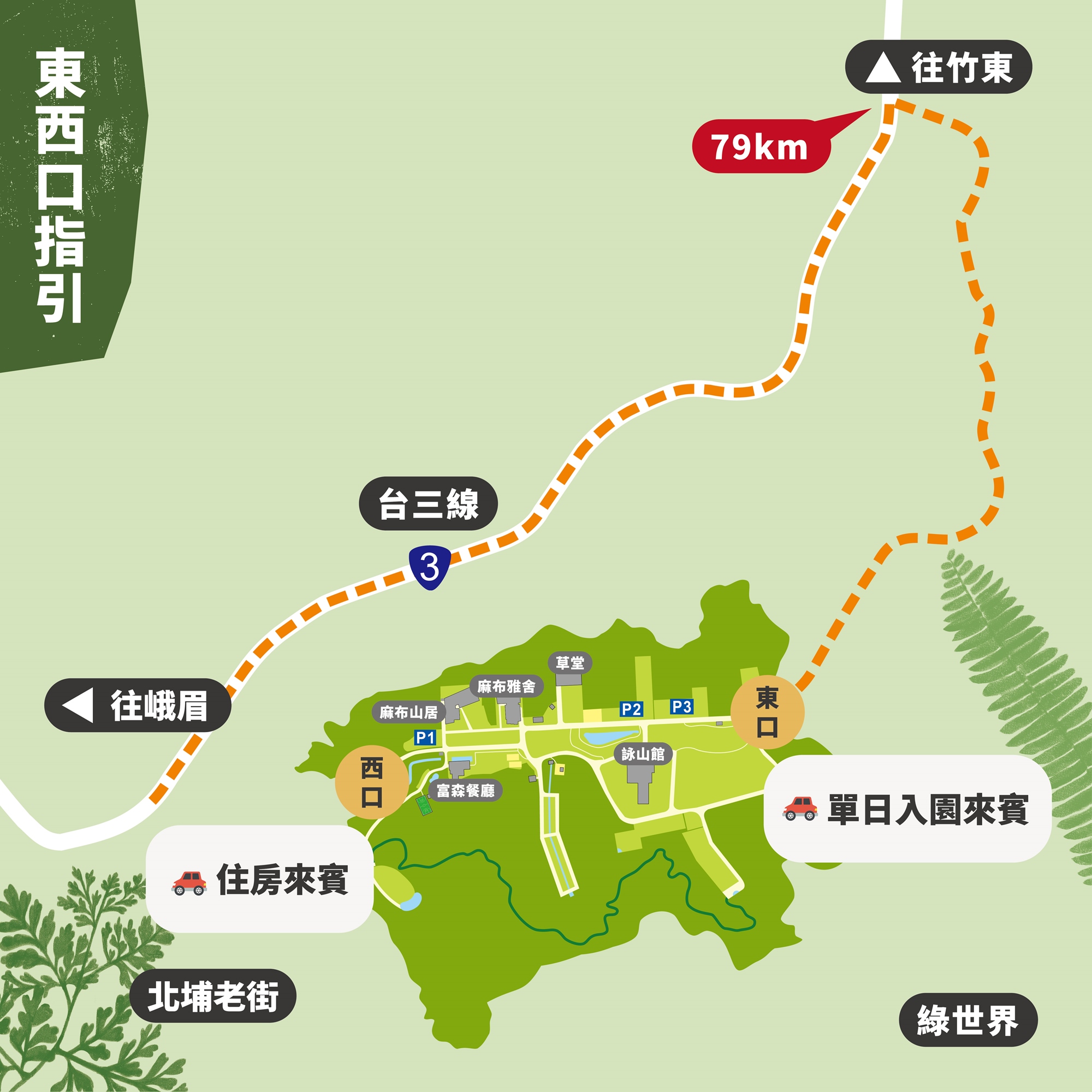 1. 單日入園賓客:導航設定「綠世界」 ,於台三線 79k 處轉入 ,抵達前請放慢車速,留意現場活動交通指引至麻布山林「東口」