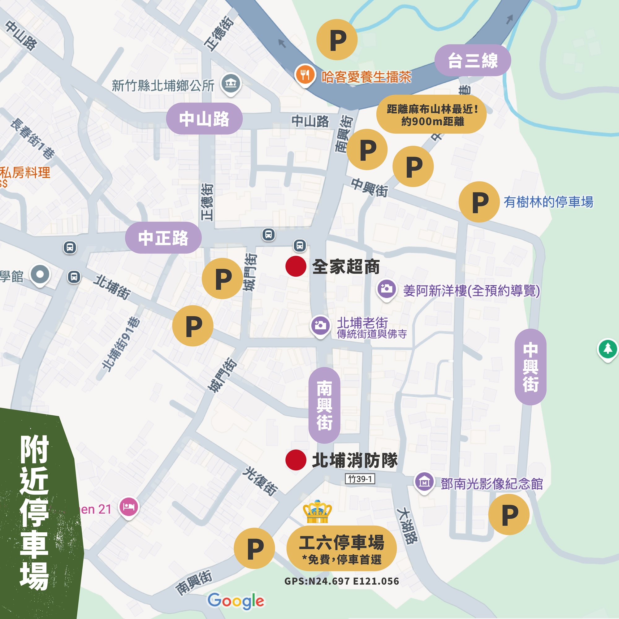 2. 麻布山林周邊可停車區域 : 麻布山林東口左右兩側聯外道路、或可停北埔老街停車場再搭接駁車或步行入園。