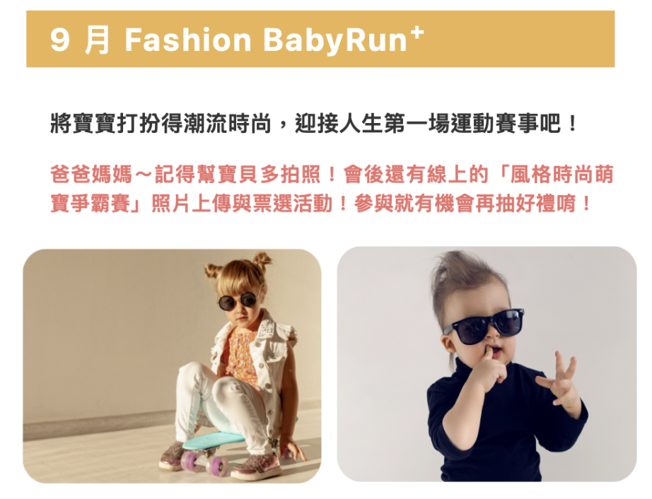 若有穿著符合 潮流時尚Fashion風格 Dress Code的寶寶,即可成為【BabyRun+潮寶貝】並獲得神秘好禮!