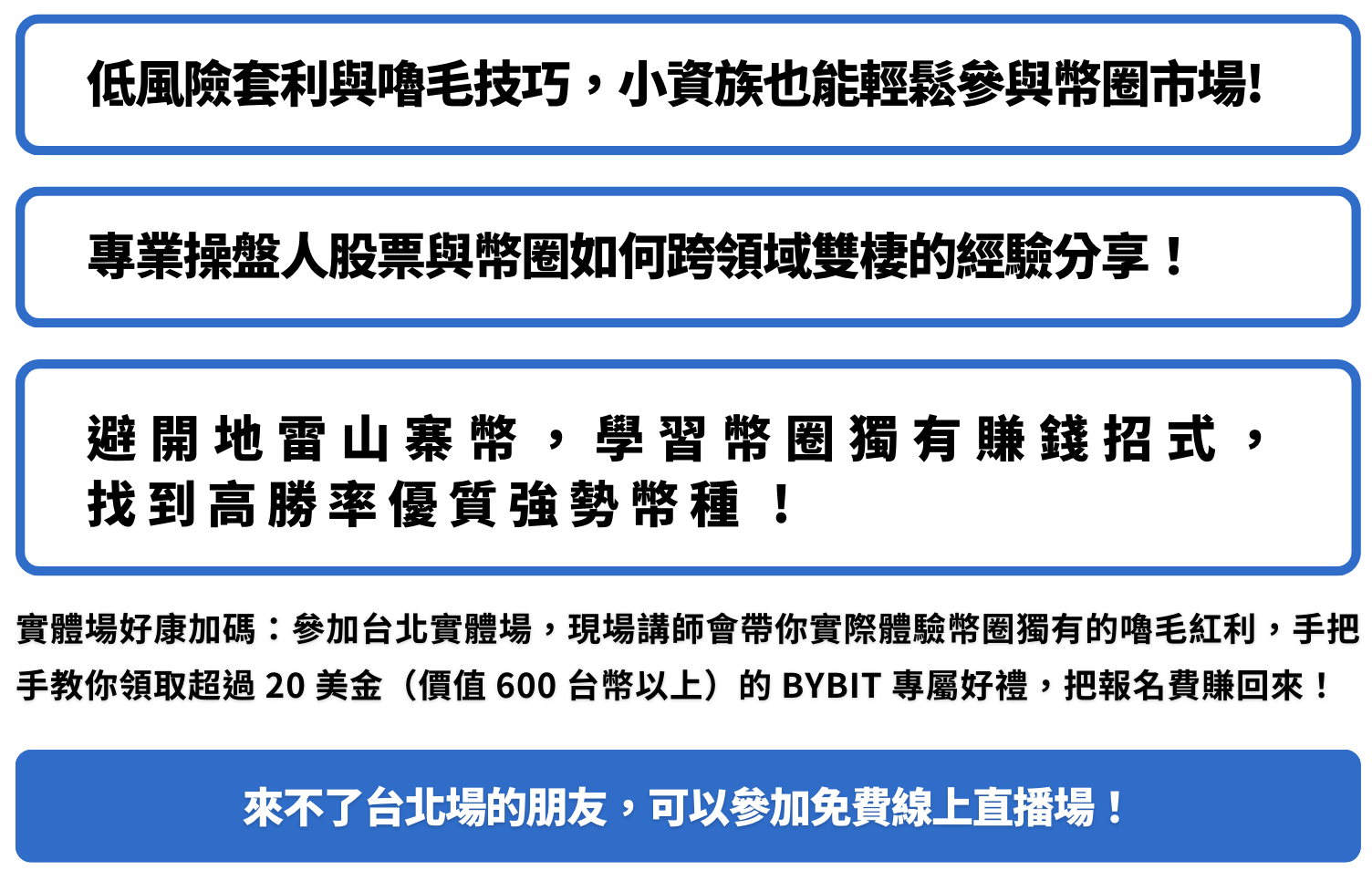 👉 實體場好康加碼:參加台北實體場,現場講師會帶你實際體驗幣圈獨有的嚕毛紅利,手把手教你領取超過 20 美金(價值 600 台幣以上)的 Bybit 專屬好禮,把學費賺回來!