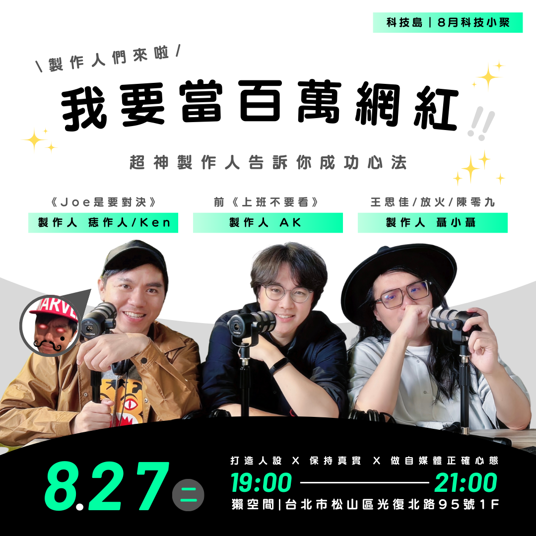 科技島本次活動講者,邀請到《Joe是要對決》製作人:痣作人/Ken、王思佳/放火/陳零九製作人:聶小聶、前《上班不要看》製作人 AK。