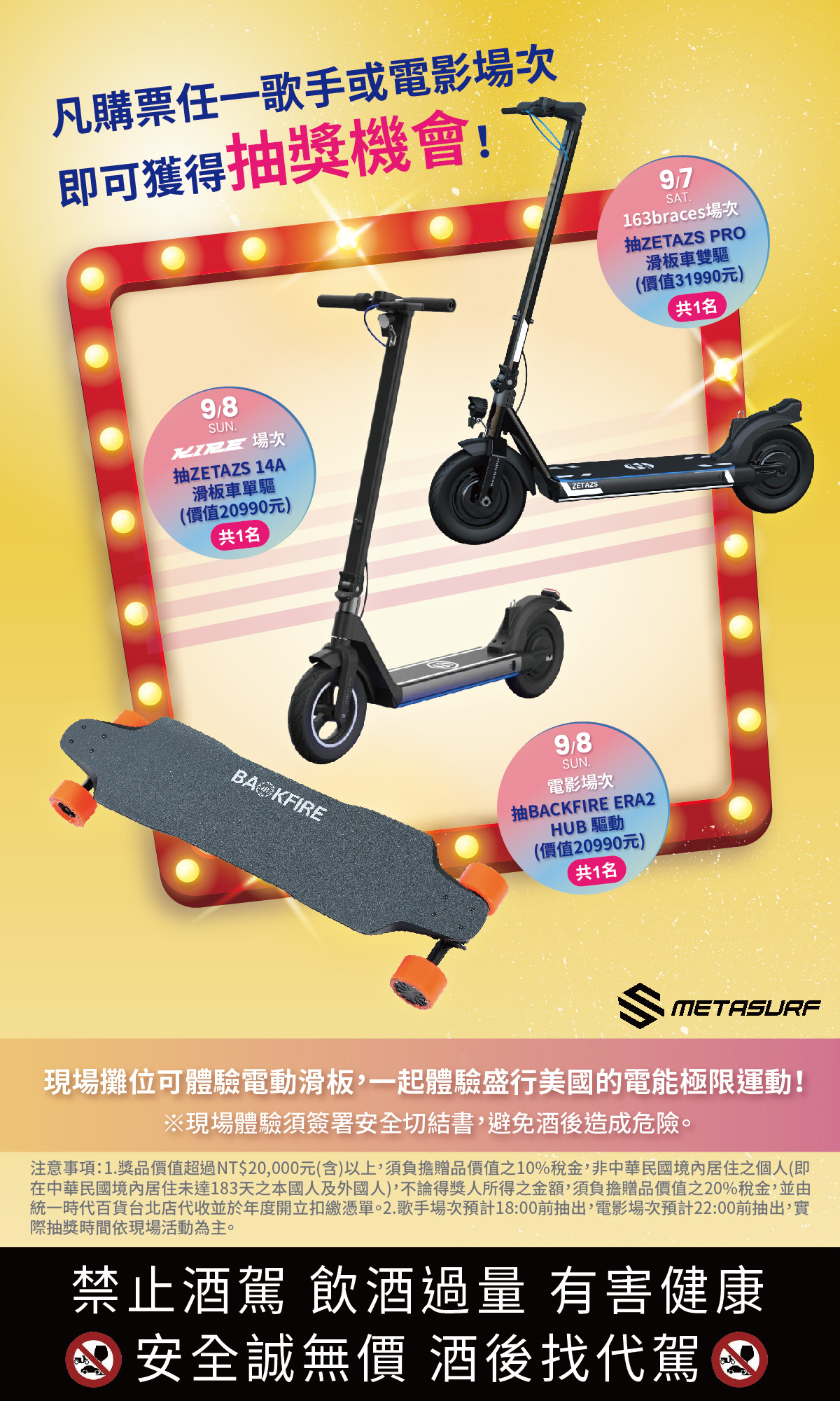 6. 本活動凡購票任一歌手、電影場次即可參加電動滑板抽獎,一張票即一個抽獎資格,每場次抽一個品項。