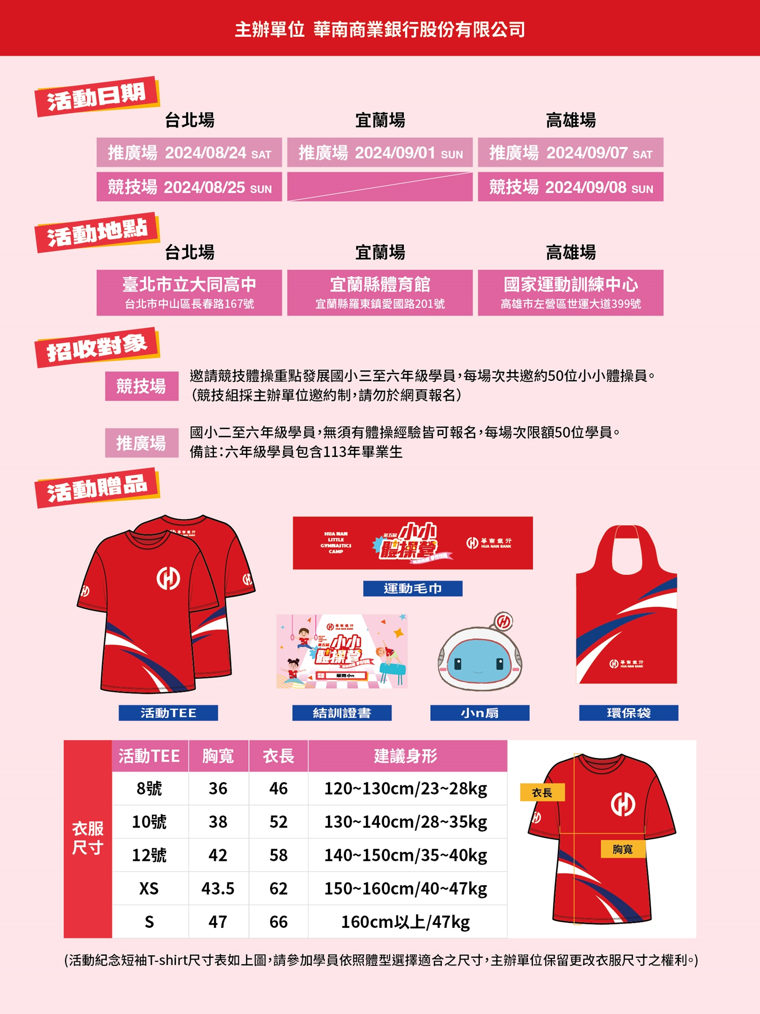 華南商業銀行股份有限公司及展逸國際企業股份有限公司(以下合稱本公司),茲因辦理華南銀行第五屆「小小體操營」活動(下稱本活動),依據個人資料保護法(以下稱個資法)第八條第一項規定,向台端告知下列事項,敬請台端詳閱及知悉:
