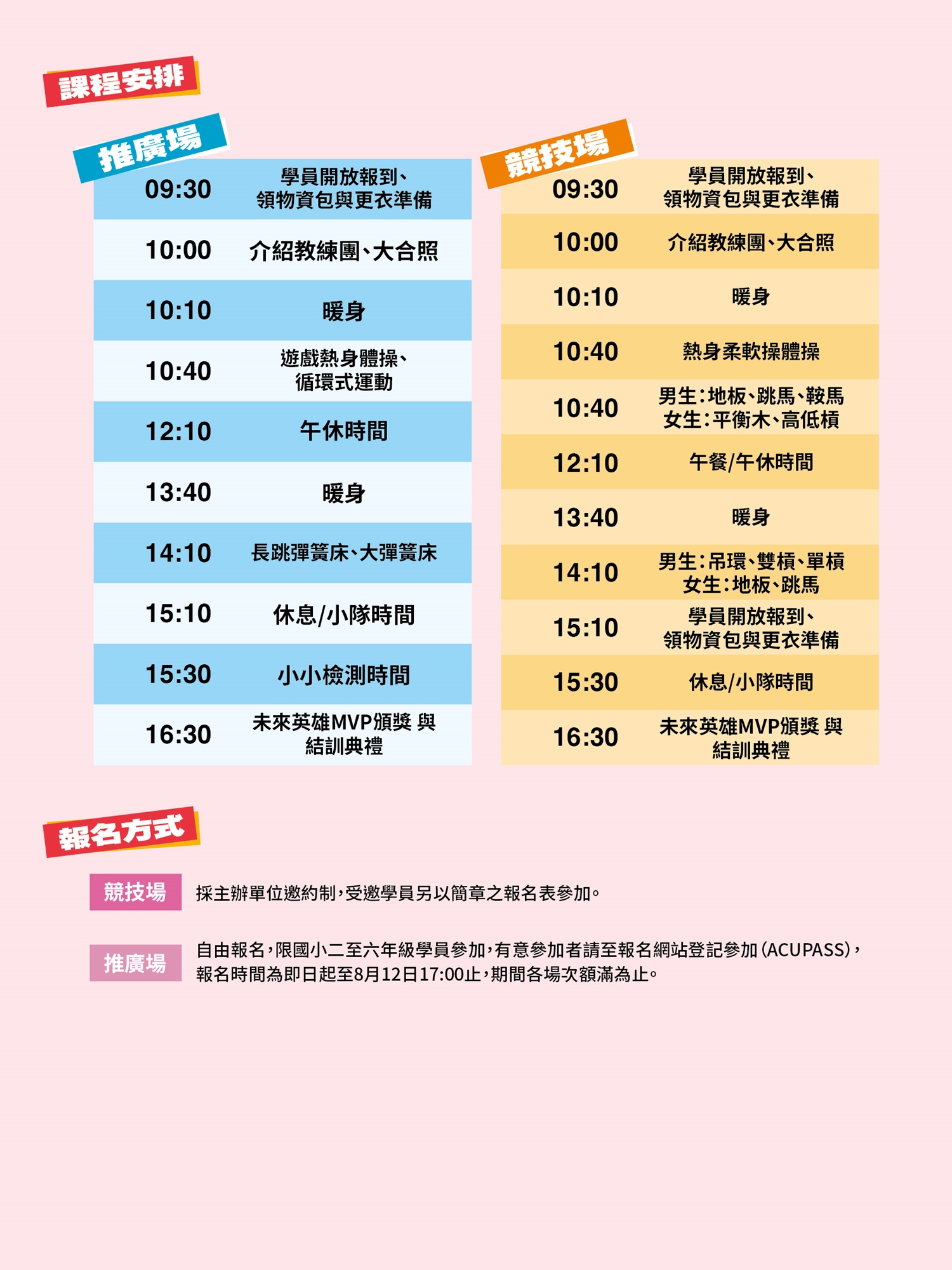 - 電話:華南小小體操營服務小組02-87681866分機557、566(週一至週五10:30 ~ 17:30)。
