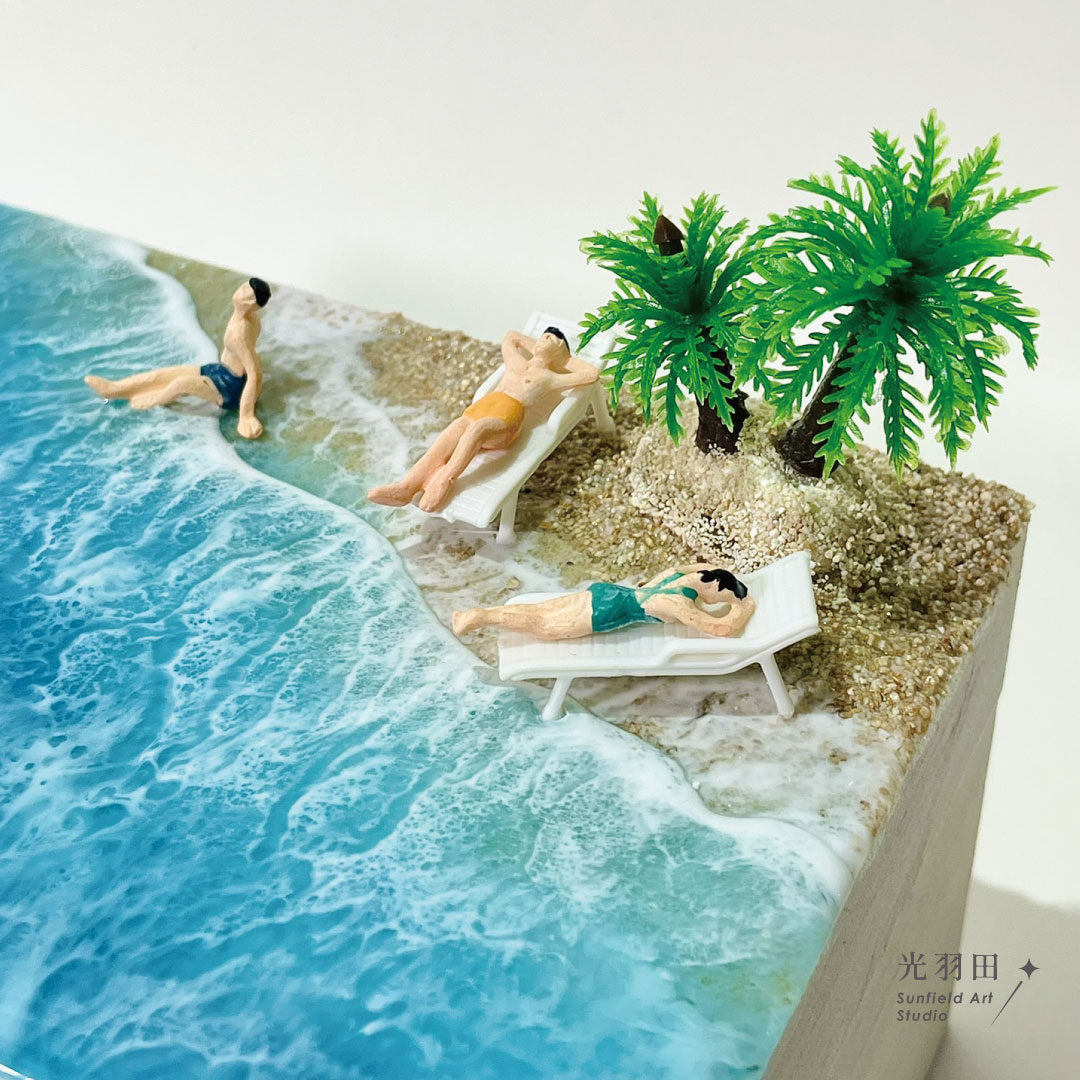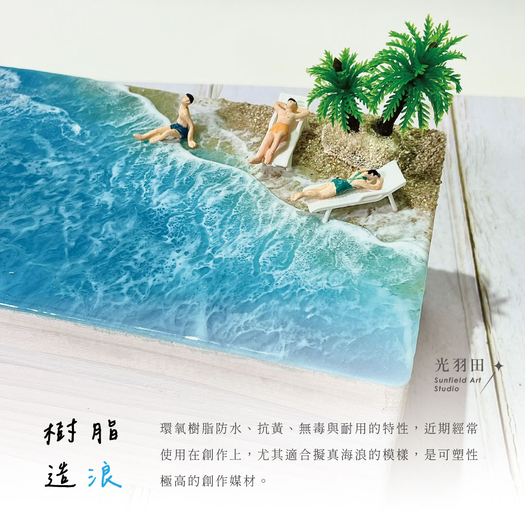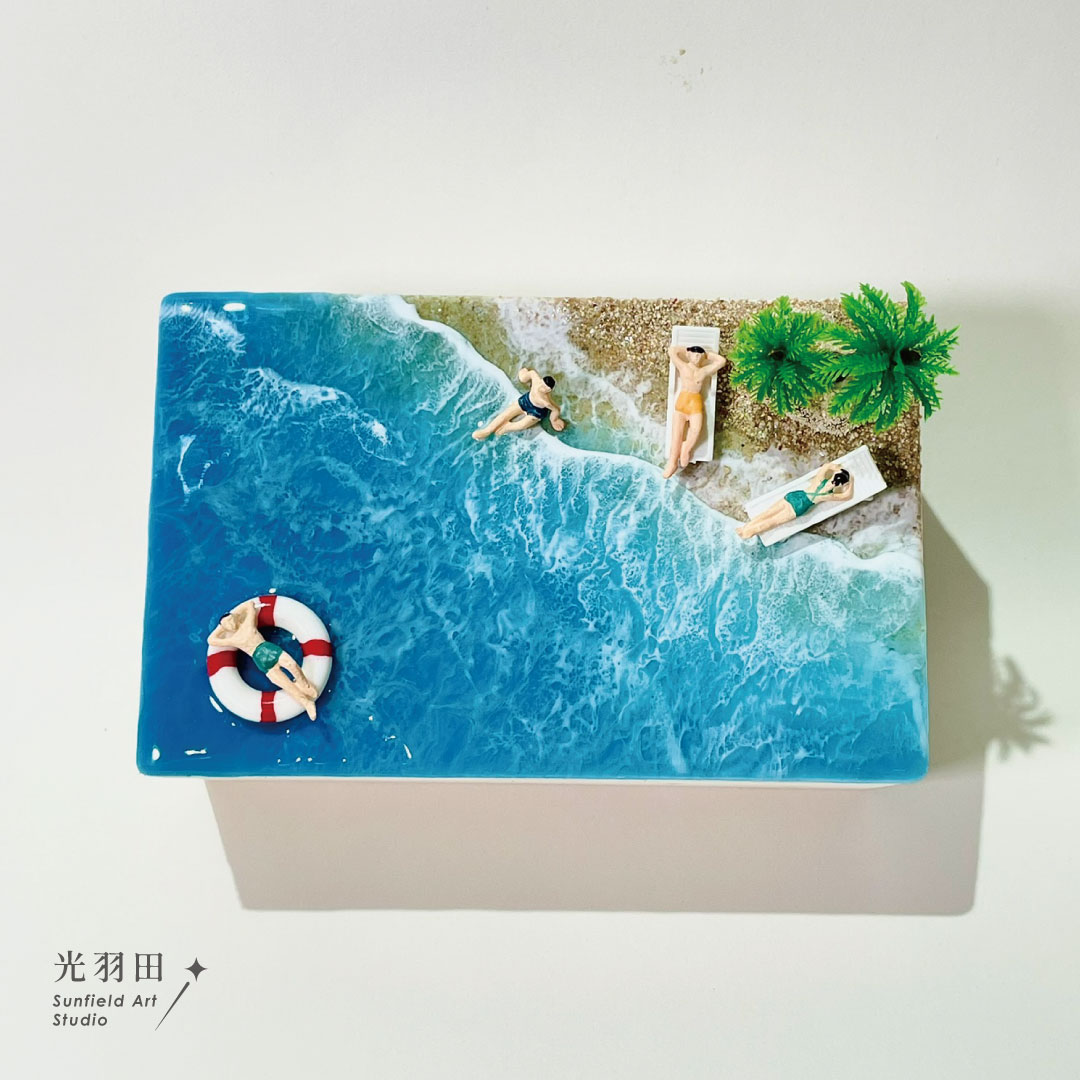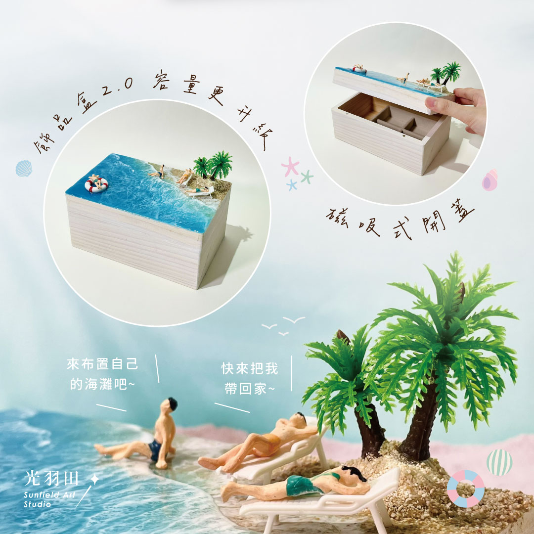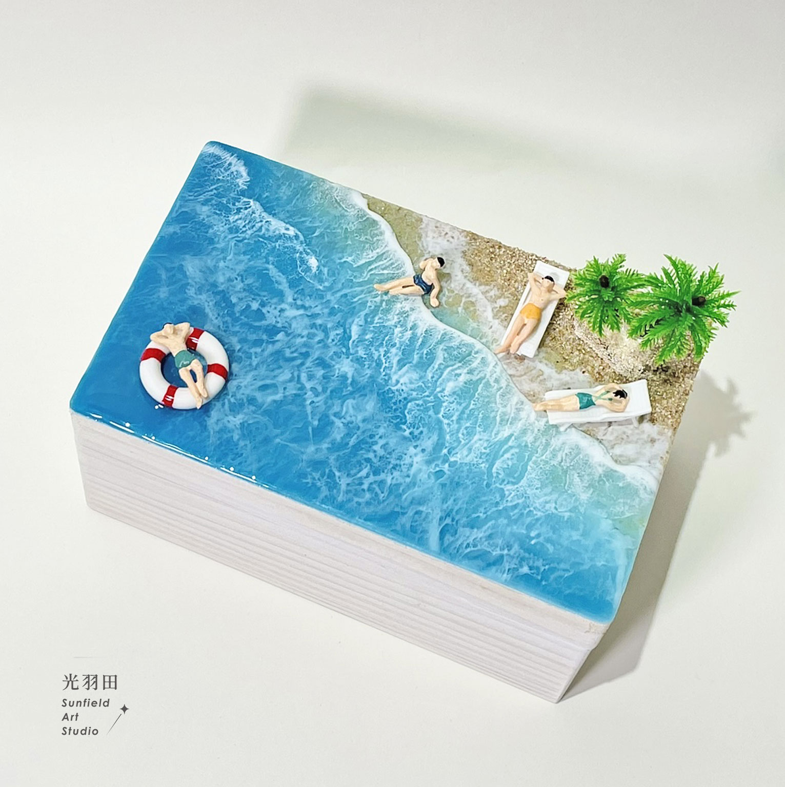 想動手打造屬於自己的海灘場景嗎?想擁有獨一無二的收納盒嗎?,所有人事物全部縮小,在沙灘開派對、享受日光浴、海中戲水、浪花拍打…等,這些全部皆可實現,享受袖珍手作的魅力與樹脂造浪的技藝,這堂課絕對適合熱愛創作的你,讓我們用雙手將環氧樹脂造出自己的海邊風光吧。