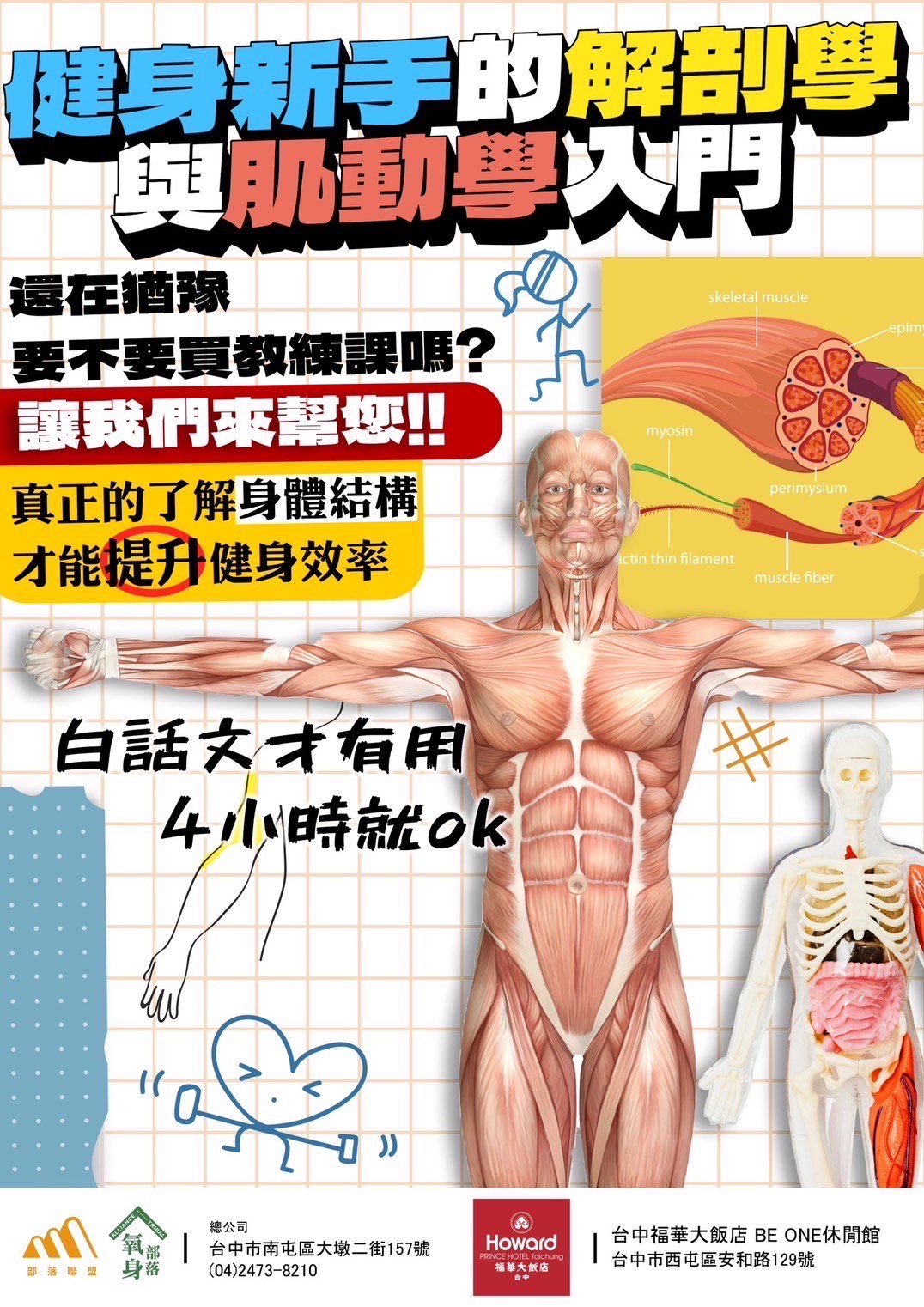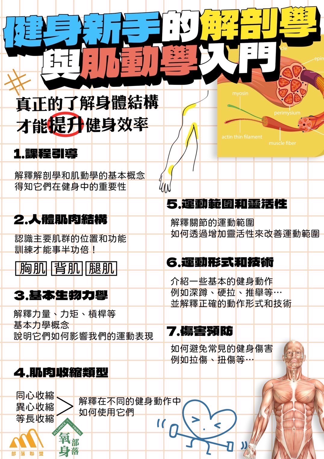 📚這門線上課程旨在為健身新手提供對肌動學和肌肉解剖學的基本理解,幫助學員建立健康的運動基礎,瞭解肌肉運動如何影響身體功能和形態,並提供實用的健身知識以確保安全有效的訓練。