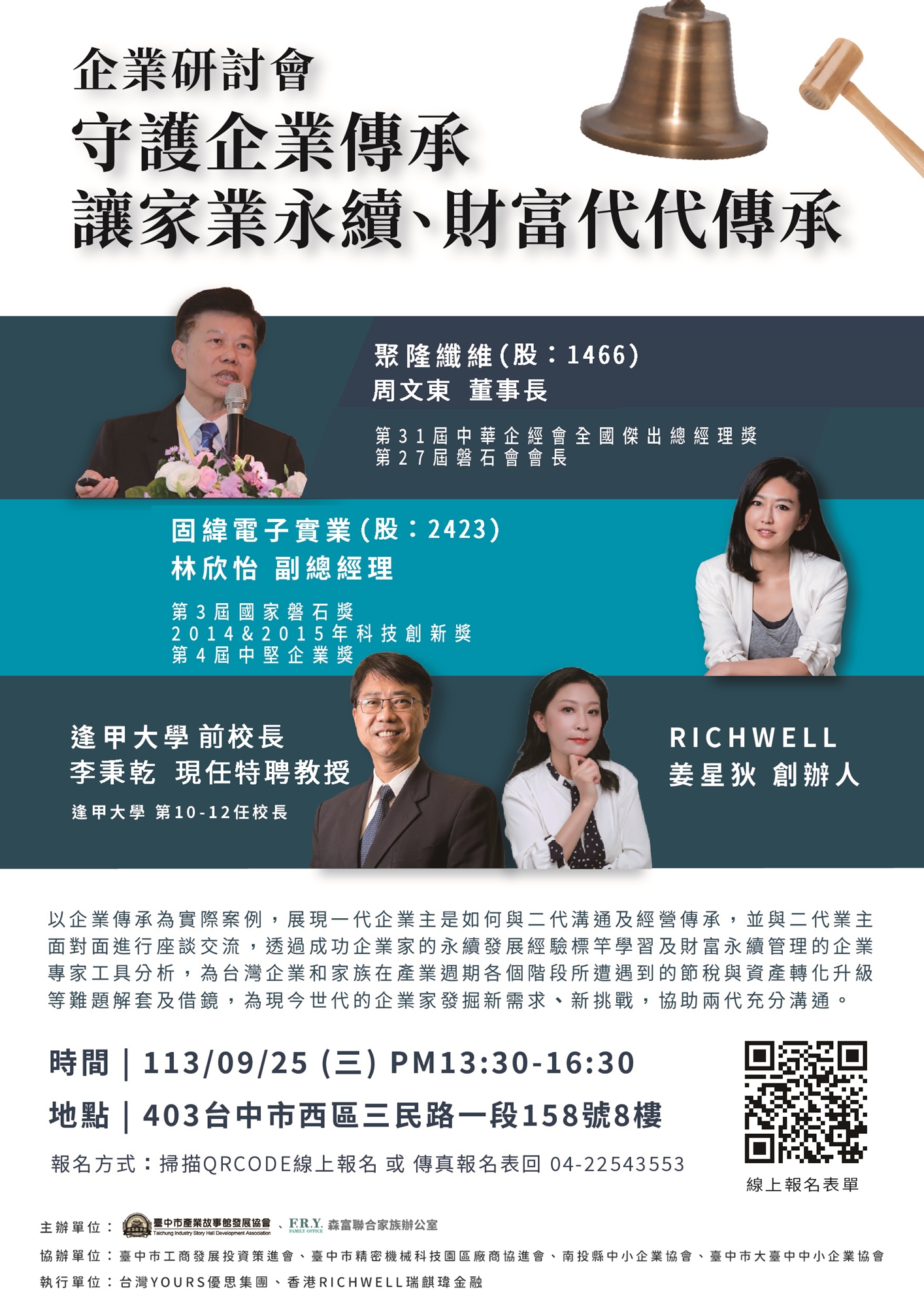 透過股權控管信託,或運用自益及他益信託架構,如何幫助企業主達到照顧二代股權並穩定經營權的目的,還能整合資產管理或多元信託工具,將由專家提供家族傳承解決方案及共同探討傳承需求解套,以守護創業家畢生打拼的心血,透過講座更探討企業發展的各階段需求、傳承風險,給企業創造財富永續與家業長青。
