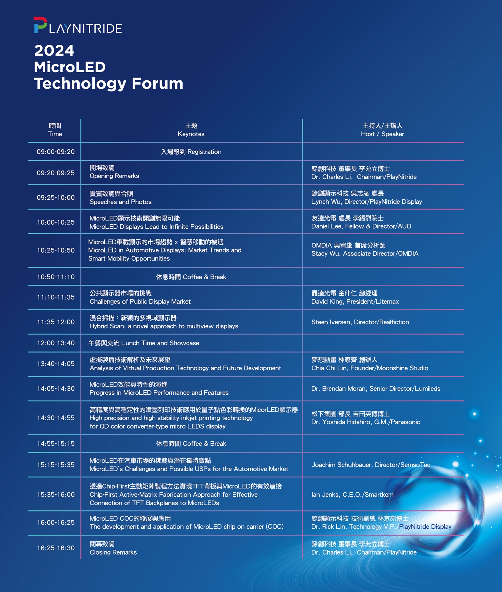 - 前瞻討論:講者將輪番分享市場對MicroLED技術的最新見解,並探討成本、產能和市場需求的挑戰與解決方案。