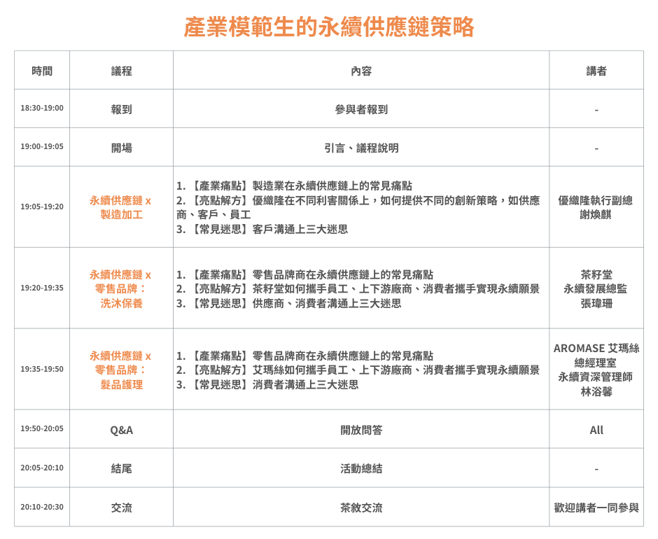 此次講座將回應上述問題,邀請製造加工、零售品牌產業中,經常榮獲永續獎項的業界「永續常勝軍」分享建構永續供應鏈的實戰經驗: