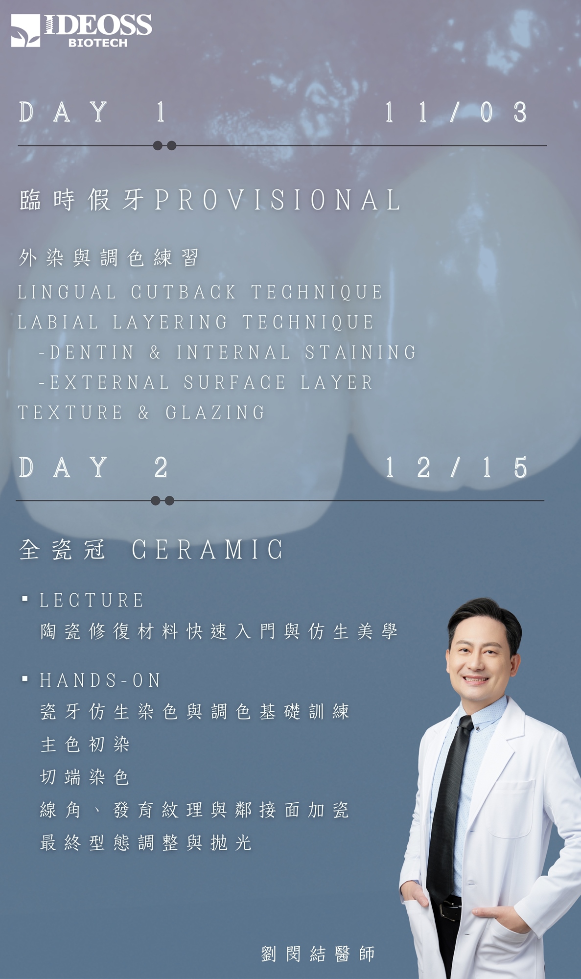 因此本次課程特別邀請贋復補綴專科 劉閔結醫師來為我們呈現美學臨時假牙的堆築方法與臨床陶瓷外染的操作流程。劉醫師在多年的經驗中,總結了許多型態與染色的個人技巧,將在此次操作課程中與大家一一剖析,希望藉由案例講解與現場實作,能讓學員們在美學的路上能夠走得更加有信心。