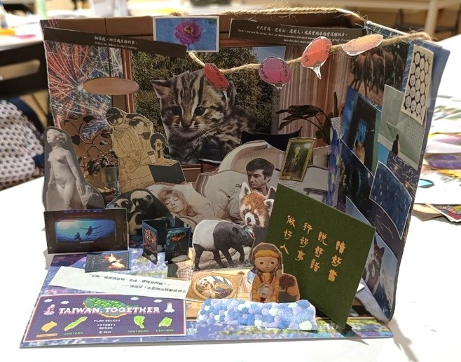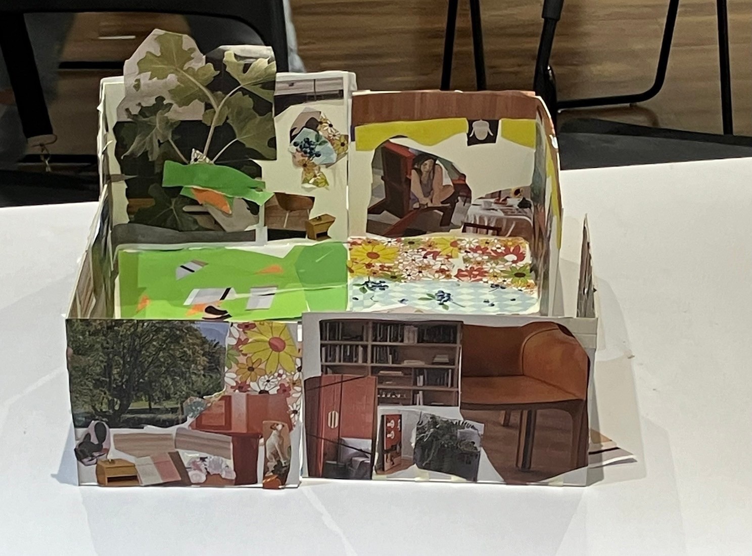 在第二階段,先用模型卡紙製作一個小房間,再使用挑選的元素進行拼貼。這個模型房間代表學員自身感興趣的人事物、願望,或自我介紹。房間的內外牆面,請分別以感性與理性兩種不同的思維,製作出截然不同的視覺調性。