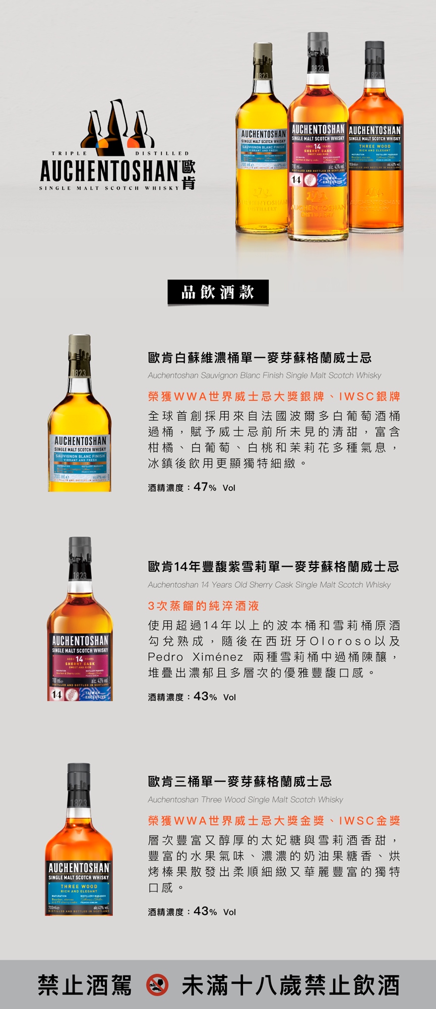 歐肯蒸餾廠位於蘇格蘭第一大城格拉斯哥(Glasgow),坐落於低地克伯屈山丘下,俯瞰著潔淨無染的克萊德河,地理位置得天獨厚,孕育出歐肯獨樹一格的柔順酒質。歐肯一直以來都堅持全程3次蒸餾,擷取到的酒體更乾淨、純淬,賦予威士忌獨特而強勁的生命力,本場活動將由品牌大使帶領來賓品飲富有特色的三款歐肯威士忌,品味酒體的芳香甘醇綿長尾韻。