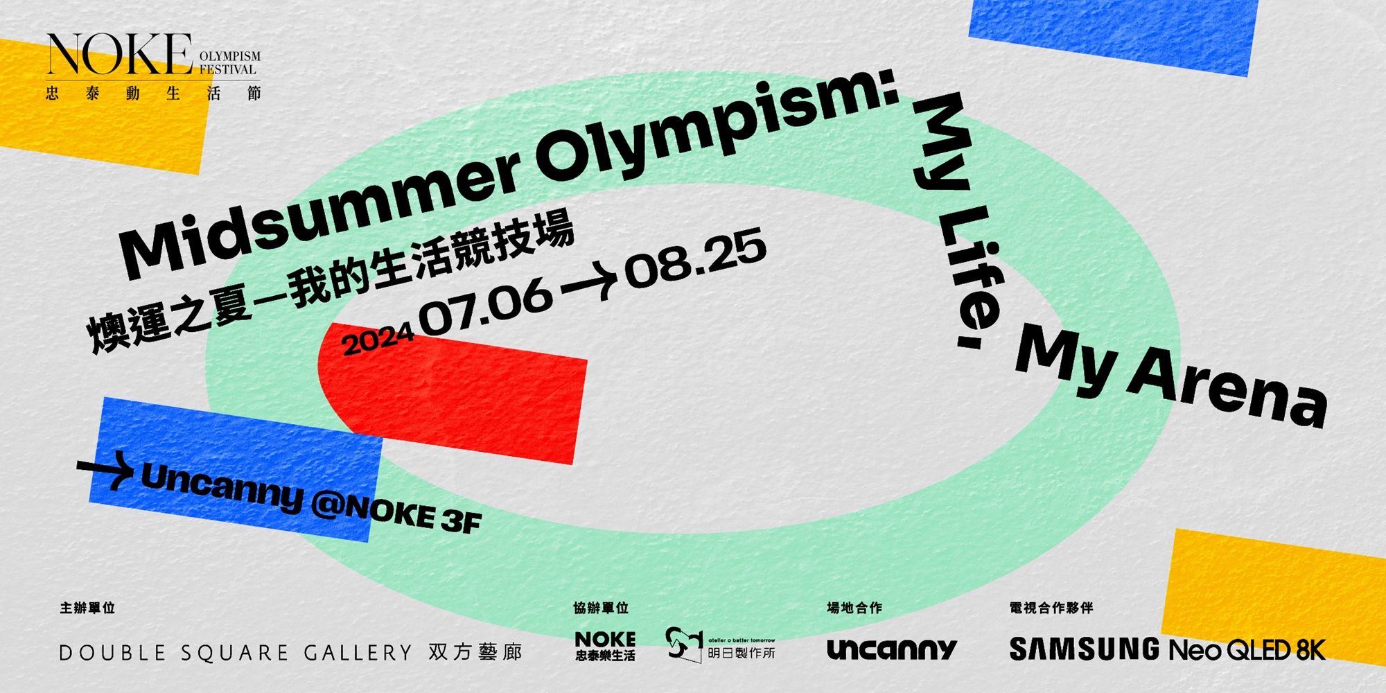 双方藝廊將於 7 月 6 日至 8 月 25 日推出展覽「燠運之夏—我的生活競技場」。首次踏出藝廊空間,以快閃/微型展(Pop-up Exhibit)的形式參與Noke忠泰樂生活「2024 Ha Ha SUMMER×忠泰動生活節」,並於商場三樓 Uncanny 展出。突破傳統白盒子形象與限制,透過將藝術觀賞體驗融入複合式商場中,觀眾得以在購物、休閒之餘,豐富觀賞體驗且即時與藝術作品互動,促進社會大眾的藝術參與,使其成為日常生活的一部分。今年夏天再度迎來第三十三屆巴黎奧林匹克運動會,這場全球盛事不僅是體育界的盛會,展覽也以奧運為契機,將運動與日常生活的緊密連結作為主題,匯集了來自不同背景的 10 位藝術家,包括林良材、姚瑞中、陳怡潔、陳萬仁、郭彥甫、黃海欣、崔廣宇、張育嘉、羅懿君、尚恩.格萊德維爾( Shaun Gladwell ),藝術家通過各種獨特的視角和媒材,展示運動與藝術如何互相啟發與共容。