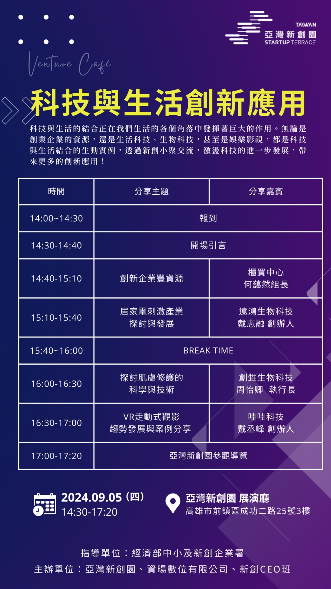 👉對創業輔導籌資機制、居家電產業、創業、生活科技、生物科技、VR感興趣的朋友們。