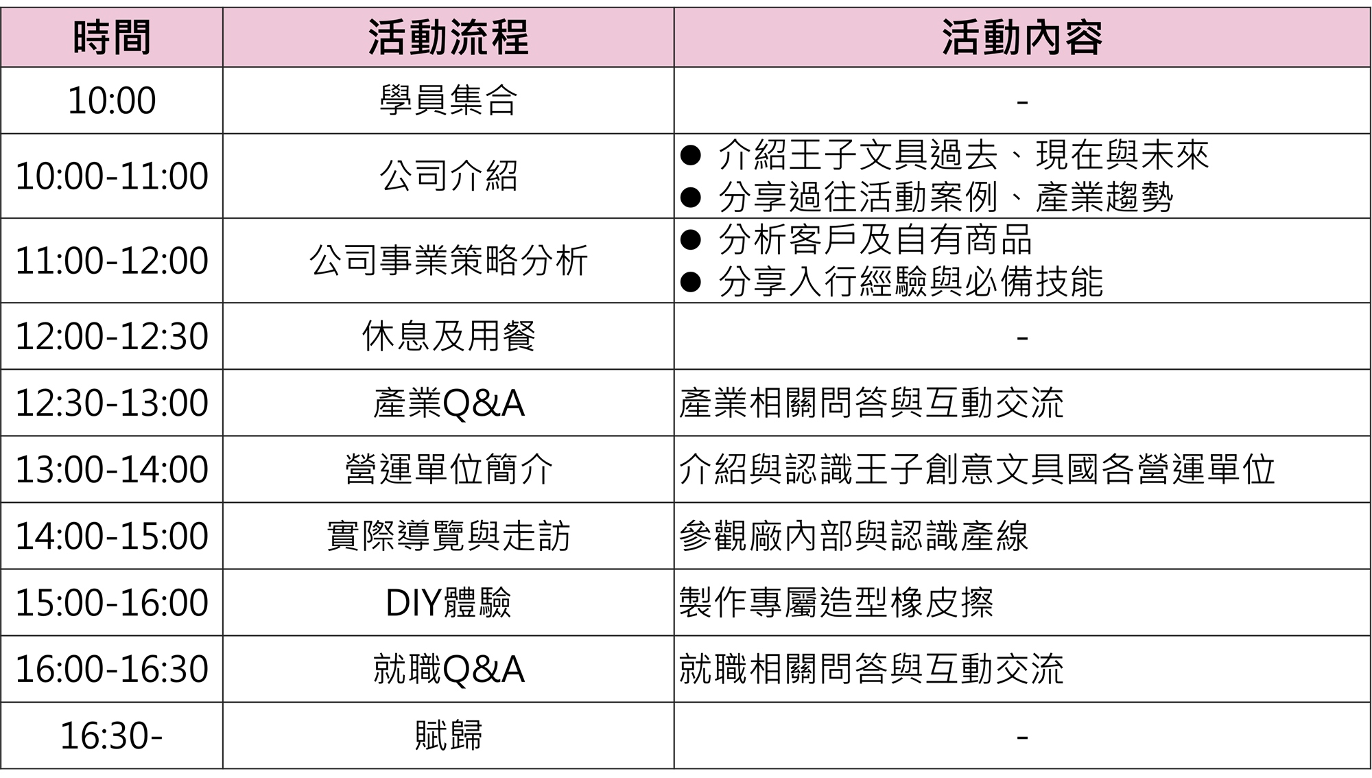 本次體驗榮幸邀請到-黃偉綱執行長,從經營理念與方針帶入,揭開文具產業的秘辛,並公開工廠內部與產線,讓學員認識到創意文具的製造過程與產業甘苦談;本場職場體驗將會製作完全無毒環保材質的橡皮擦 DIY ,而更多精彩與值得一看的內容,邀請學員親自走訪一趟,絕對會不虛此行。