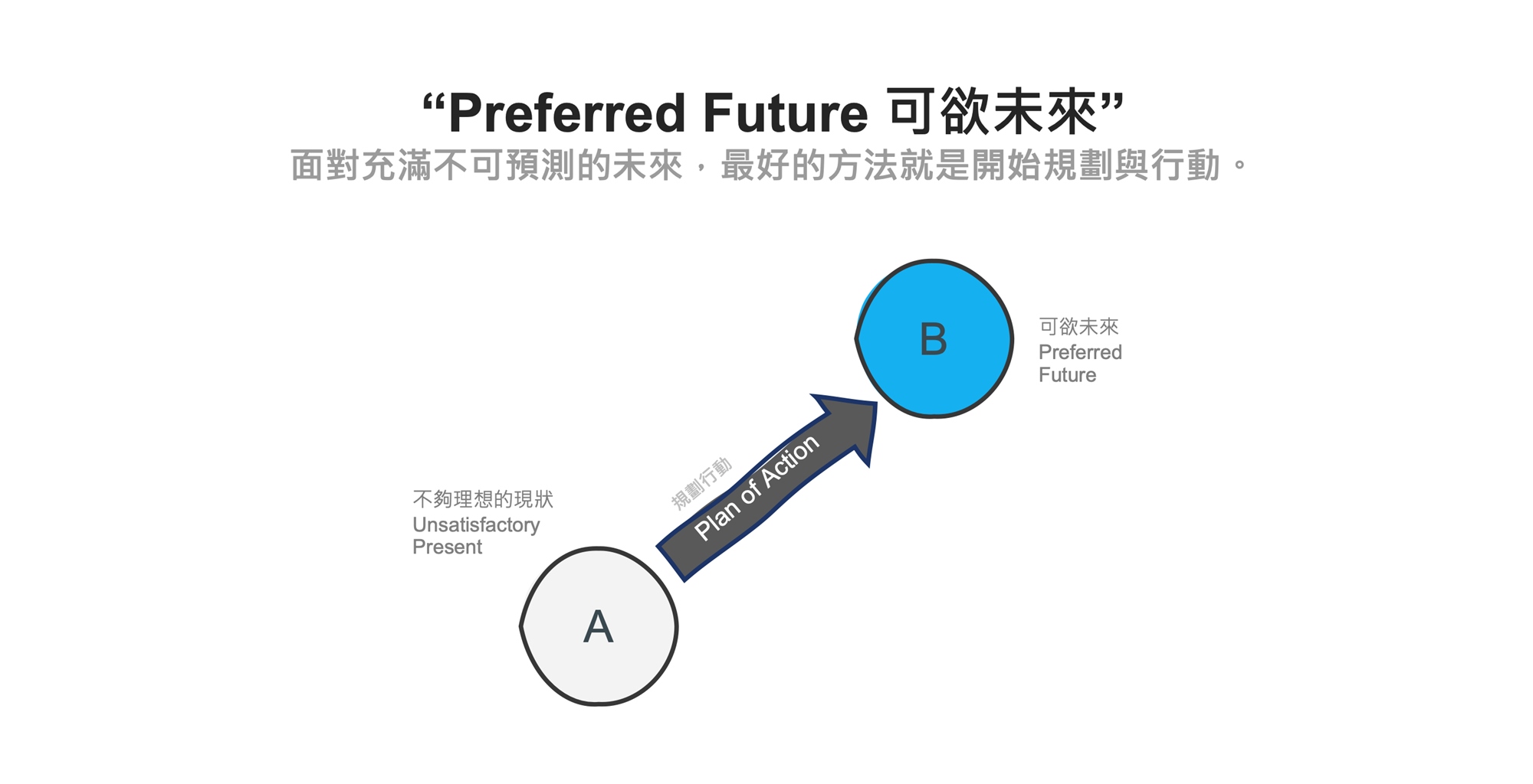 今年度新一代設計產學合作主題「Preferred Future可欲未來」挑戰未來趨勢,可欲未來源自未來學家Jim Dator(2019)曾提到未來思維的策略佈局應該挑戰現有假設,正視未來資訊,並評估發展目標 ;利用機會降低風險,減少意外後果,並思考如何引入利害關係人參與,為下個世代佈局。
