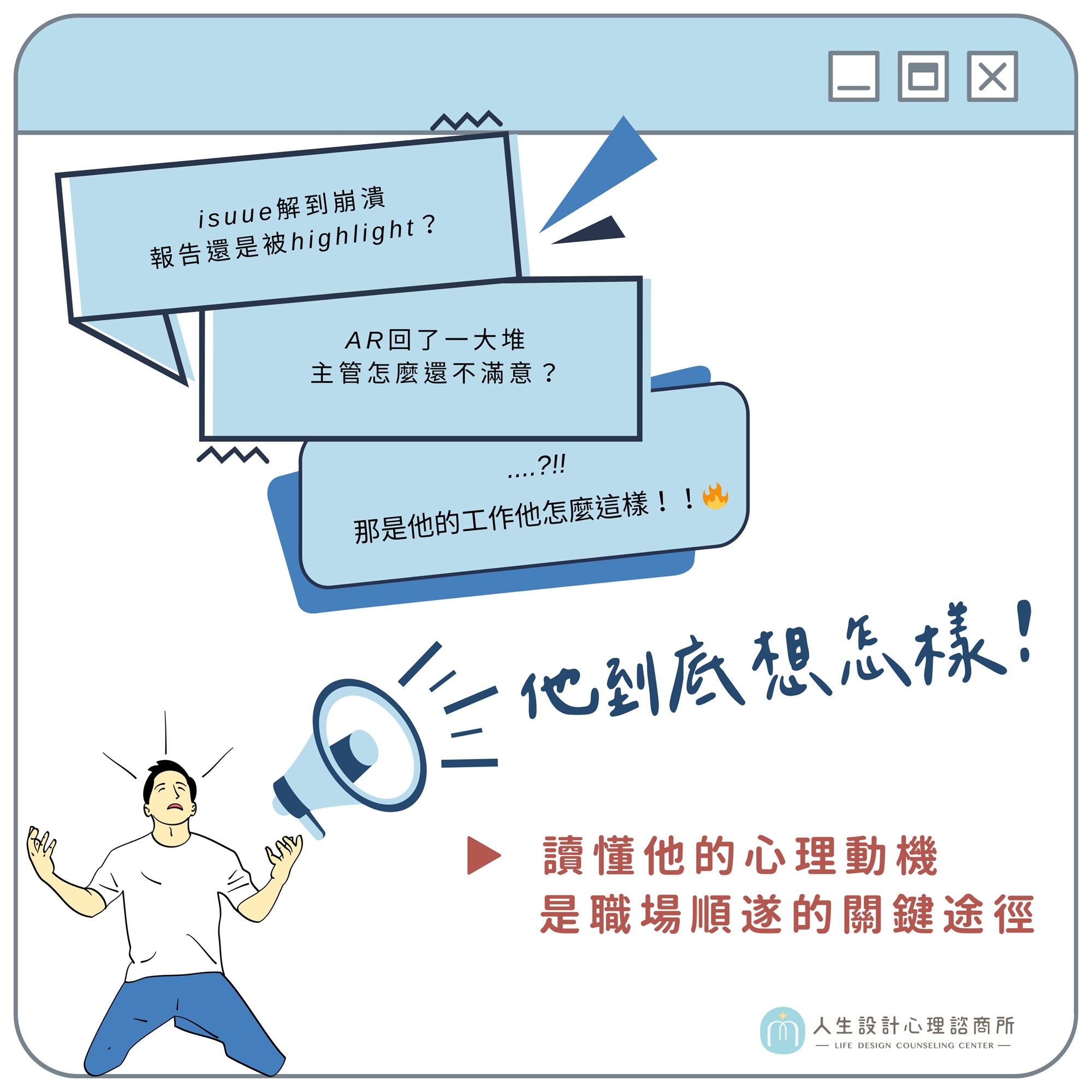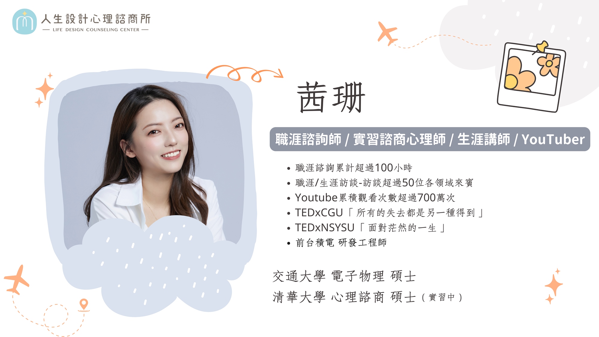 - 10年理工經驗 x 心理諮商專業 x 職涯諮詢超過100小時 x 自媒體跨域