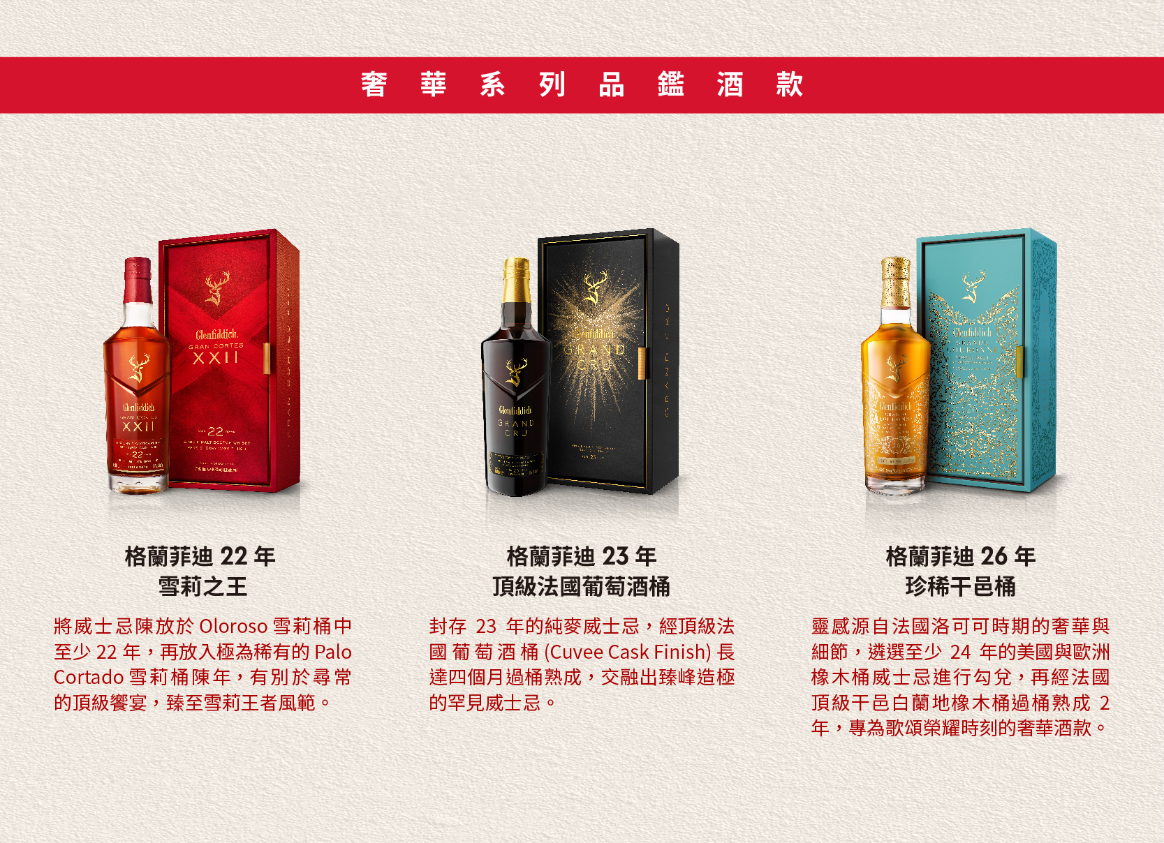 凡報名者皆享有格蘭菲迪奢華系列 22年、23年、26年,三支珍稀酒款品鑑與兩款餐搭小點