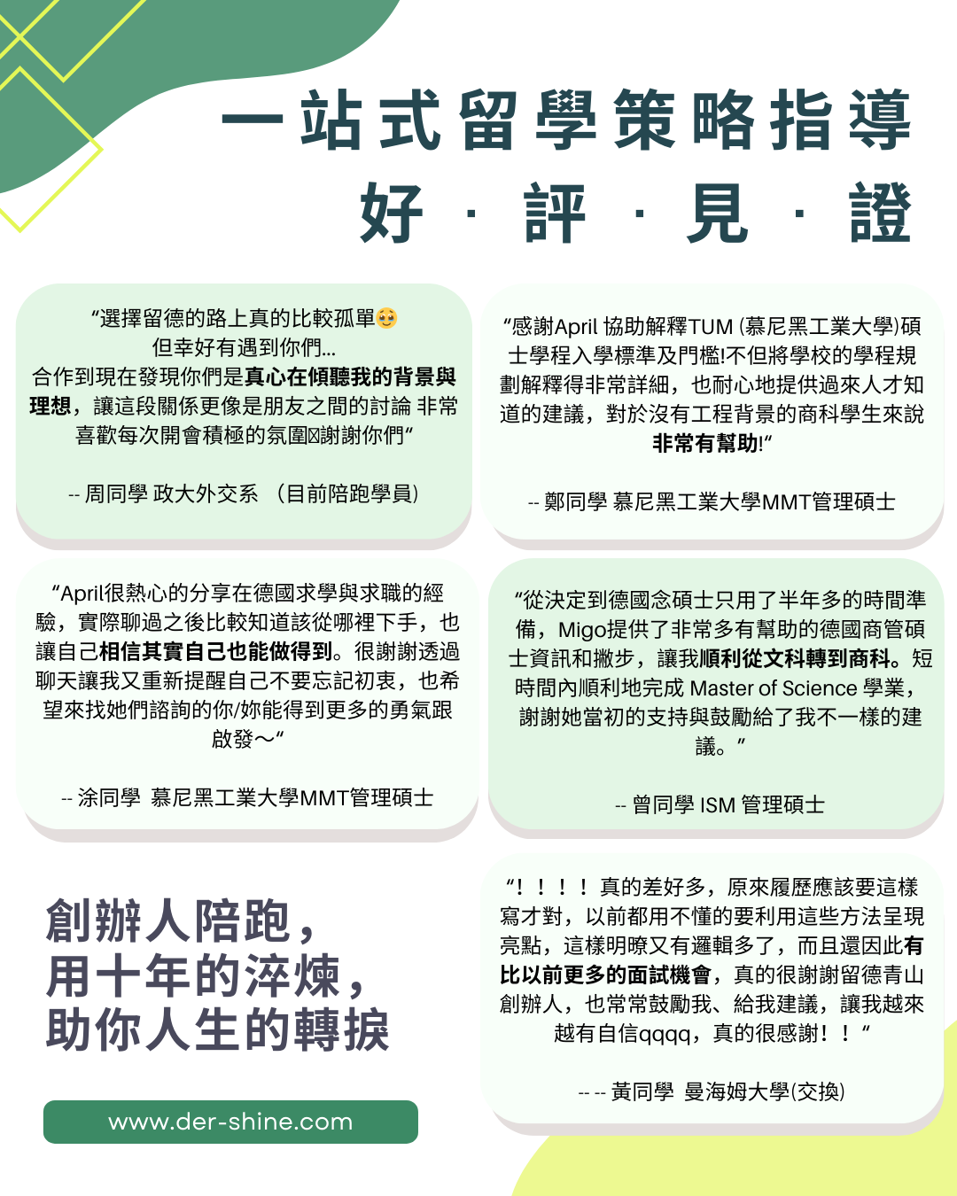 這一切都從德國留學開始,身為過來人,Migo跟April 能夠提早幫你在學路上避坑,求學目的「以終為始,職涯導向」,改變人生軌跡就從此刻開始!