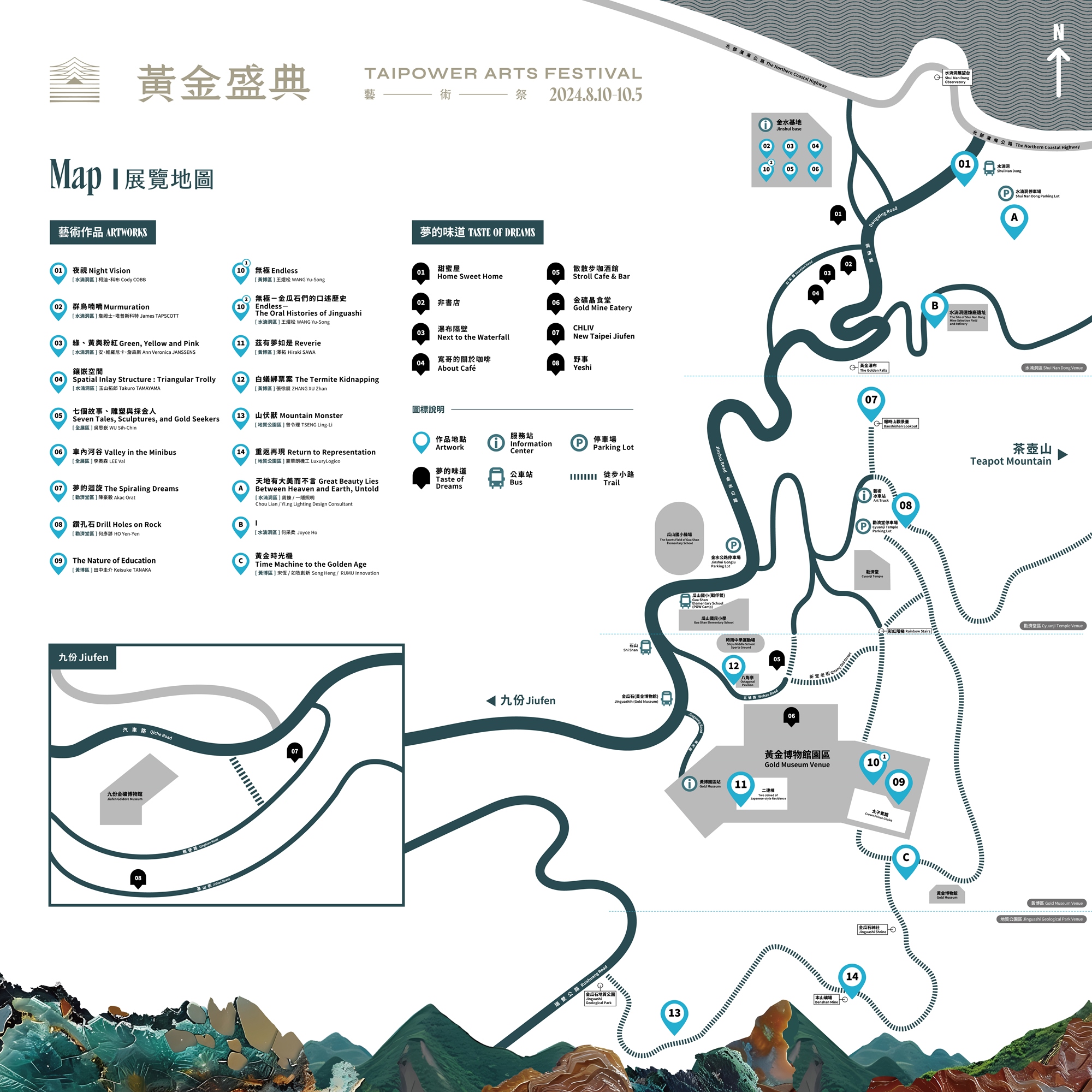 從黃金博物館園區出發,走訪重要古蹟場域,再沿著山城的路徑登高,抵達金瓜石信仰中心-勸濟堂,從藝術與在地的關係中,邀請民眾來一場跨時空的清醒夢。