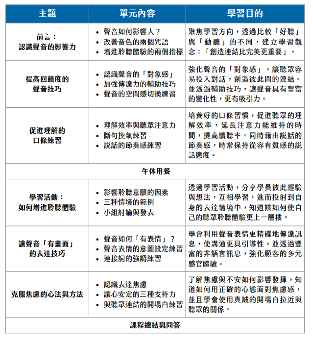 本工作坊旨在提升的聲音表達技巧,以增強簡報時的影響力。在新創企業進行商業計畫書向投資人報告及創業點子簡報時,聲音扮演著至關重要的角色。首先,聲音的質量直接影響投資人的第一印象。一個清晰、穩定且充滿自信的聲音能夠建立專業形象,提升說服力。其次,聲音的抑揚頓挫和語調變化能夠吸引聽眾注意,增強簡報的感染力。適當的聲音強調和停頓有助於突出關鍵訊息,使投資人更容易抓住重點。聲音的表情和情感表達也是關鍵。如何創造有連結的聲音表達演說.透過充滿熱情和真誠的聲音能夠傳達創業者對項目的熱愛和信心,激發投資人的共鳴和興趣。工作坊的課程將介紹聲音對聽眾的影響,並探討改善音色與增進聆聽體驗的方法。參與者將學習如何運用聲音技巧增加回饋度,並通過空間感切換練習強化聲音的「對象感」。此外,課程將涵蓋口條訓練,提升理解效率和注意力維持。學習活動環節將促進小組討論與分享,幫助參與者提升實際應用能力。最後,課程將教授克服焦慮的方法,使參與者能以自信和從容的態度進行表達。