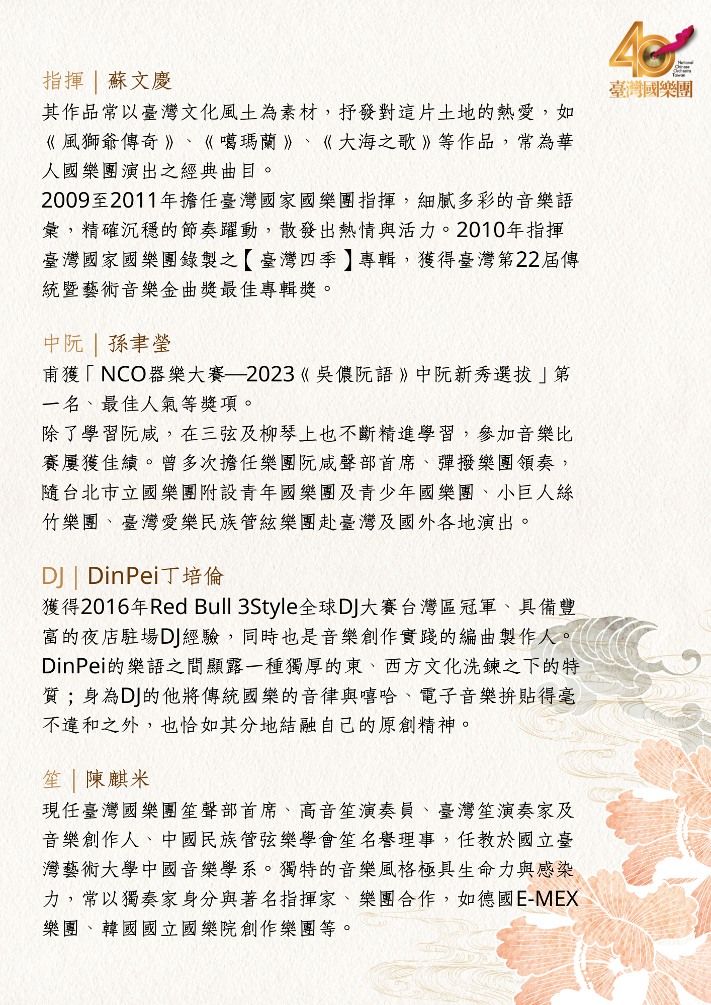 臺灣國樂團迎來創團40周年慶典,這次特別邀請與NCO有著深厚情感連結、深具文人氣息的當代優秀作曲及指揮家——蘇文慶老師,攜手NCO青年笙演奏家陳麒米、胡琴演奏家葉維仁、榮獲2屆Red Bull 3Style全球DJ大賽臺灣總冠軍DinPei丁培倫及甫獲NCO2023年《吳儂阮語》中阮新星─孫聿瑩,來與大家共同回顧過去的經典名曲。