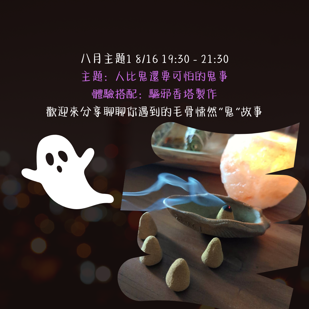這一次不說鬼故事,來聊聊在職場中可能有跟同事主管或者奧客間的離奇溝通事件,或者生活中是容易吸引怪人靠近的體質,總是阿砸衰事撞上身的各種小故事,都歡迎來跟我們聊聊天抒發!當晚的亮點 - 驅邪香塔手作體驗,教你製作自己的氣場防護小物!可用來淨化環境氣場、驅散小人,焚燒所有阿砸不愉快,想要體驗的朋友不要錯過這次機會!