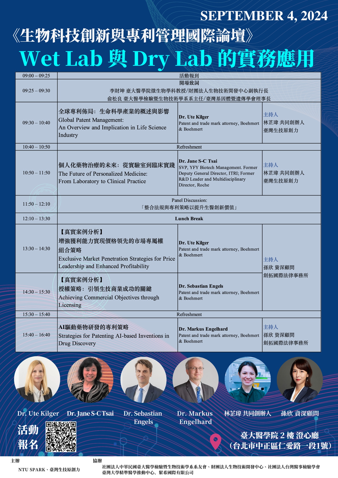 本次論壇旨在深入探討這場革命性的技術協作。我們誠邀在國際上經驗豐富的專家,和與會者共同剖析跨領域整合在現代研究環境中的前沿策略、潛在挑戰以及實用解決方案。此外,德國頂級律師事務所 Boehmert & Boehmert專利律師將與各位全面解析全球專利佈局和法規策略,闡明如何在保護知識產權的同時,靈活應對日益複雜的國際法規環境。