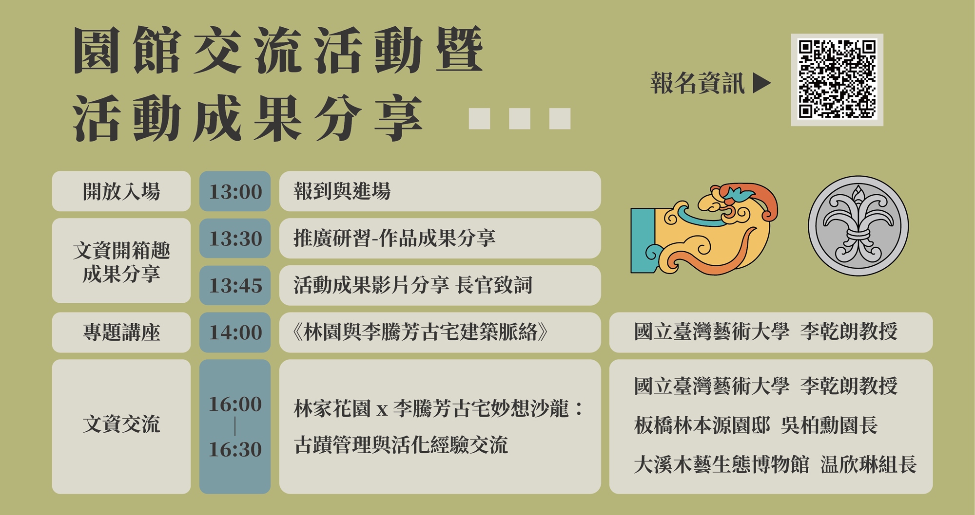 - 「文資交流」:邀請李乾朗教授、林家花園吳柏勳園長、木藝生態博物館教育推廣組温欣琳組長,以「林家花園x李騰芳古宅妙想沙龍:古蹟管理與活化經驗交流」為主題,進行跨域交流座談,分享管理與活化的實務經驗與歷程。