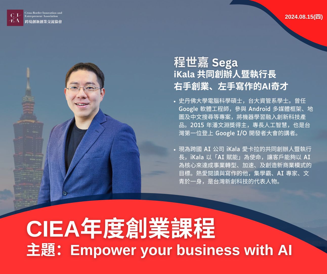 八月,我們CIEA創業大,我們邀請到的是Sega 程世嘉 --- iKala 共同創辦人暨執行長 ,作為特邀講者,為大家帶來精彩分享——《 Empower your business with AI 》。