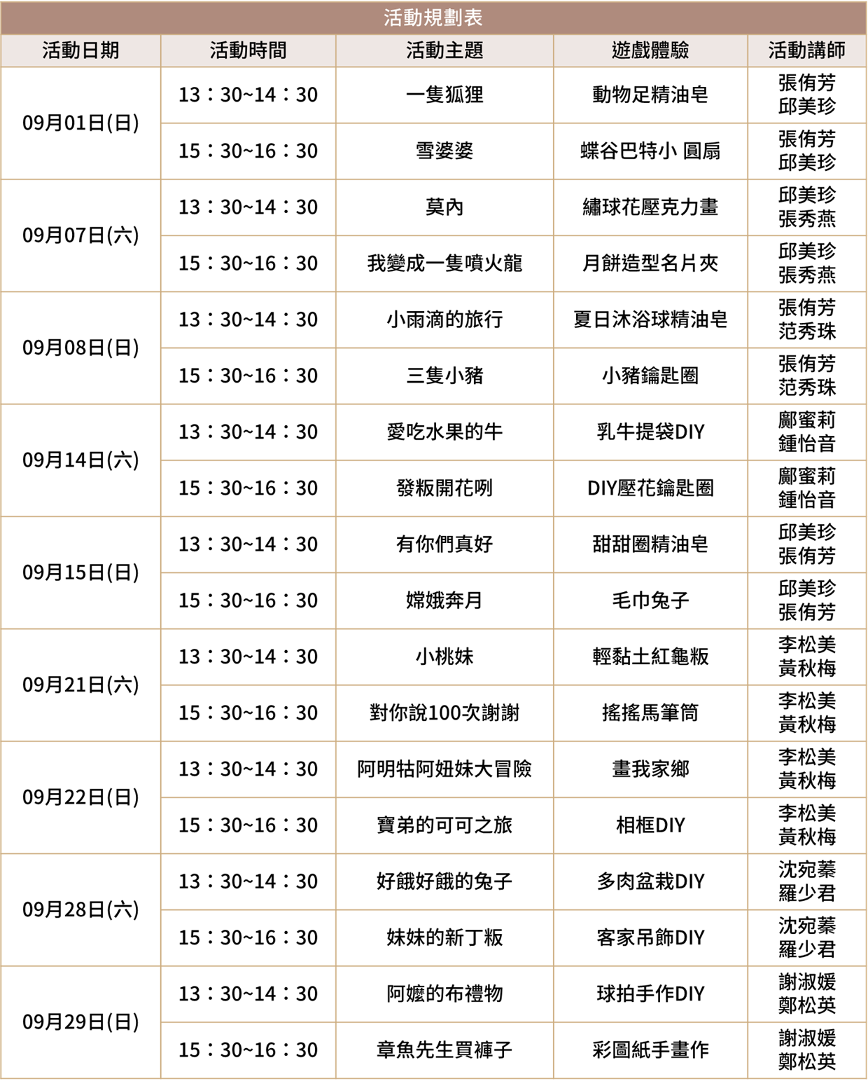 感謝9月份大家的支持,中心這裡為小朋友另開了一個有趣的客話講故事,於每個周末下午會有兩場一小時的講故事活動,不只有專業老師講繪本故事給小朋友聽,還會帶些簡單的互動小體驗,每場故事不一樣,還有小禮物可以拿唷!!希望大家能踴躍報名給我們鼓勵,我們會再開出更多有趣的課程,讓大家一起玩樂共學!