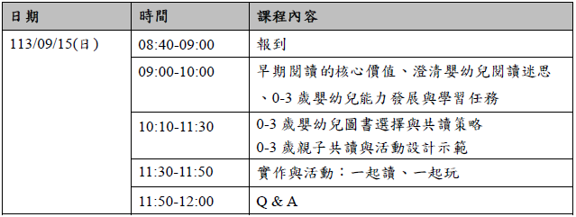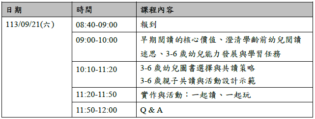 近年,閱讀推廣的年齡拓展為0-6歲,但適齡閱讀資源、閱讀興趣引導,大都仍缺乏實務經驗。本次講座分為兩場,以0-3歲、3-6歲為分野,將介紹Bookstart主要精神、早期閱讀的價值,並分別介紹0-3歲、3-6歲嬰幼兒閱讀指導及親子共讀策略與活動,讓父母親有更進一步的了解,更有信心也更願意與孩子一起共讀,建立孩子閱讀的興趣與習慣。說明如下表: