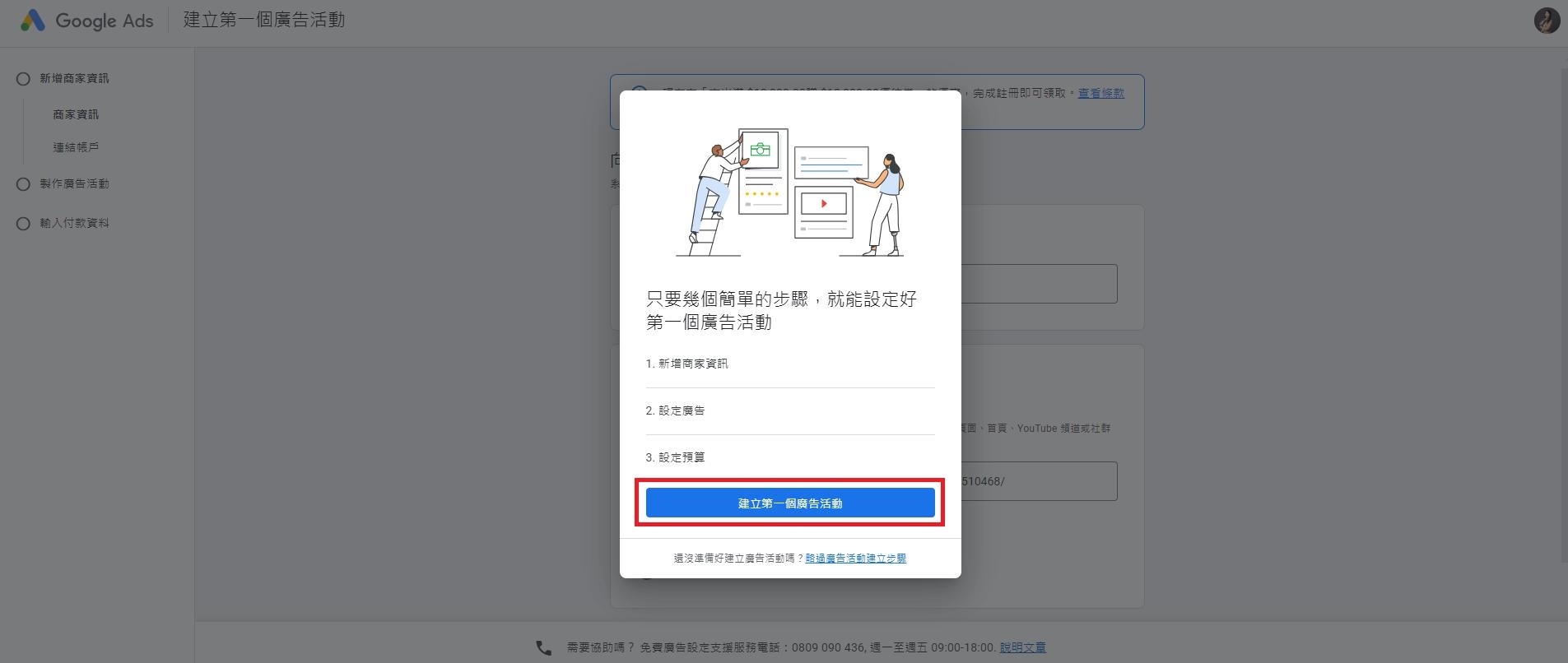 步驟六:接著按照系統指示,選擇廣告目標>新增搜尋主題>製作廣告>設定出價策略>設定預算