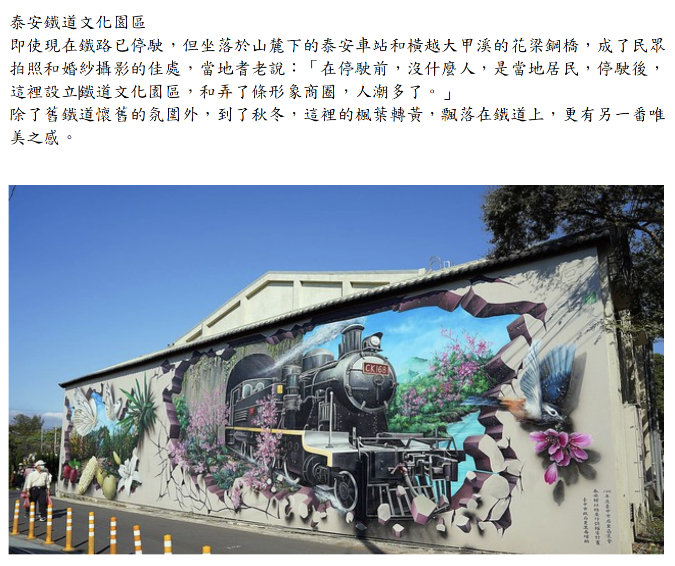 15:00-16:00 | 商圈環境走讀 泰安鐵道文化園區參訪 | 后里泰安魅力商圈 泰安鐵道文化園區 |