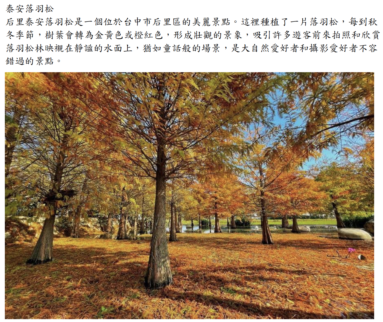 15:30-16:30 | 泰安落羽松欣賞 | 泰安落羽松。羽粼落羽松 |