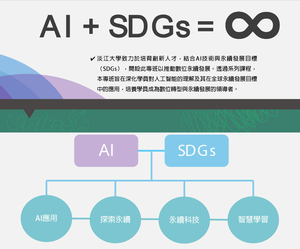 111-112年淡江大學因應教育部探索者計畫(Xplorer)精神,開設「AI程式語言」與「探索永續」通識課程,旨在強調「數位永續」(digital sustainability)的重要性,並說明本校AI+SDGs=∞的未來發展主軸趨勢。秉此精神與實務,淡江大學將113-114年,與教育部探索者計畫合辦「AI專班」,名為「AI+SDGs ╳ 數位永續與AI教育專班」,目的將運用數位技術來支持永續發展目標的實踐,永續學校教育與學習,體現其AI與SDGs之關鍵性。