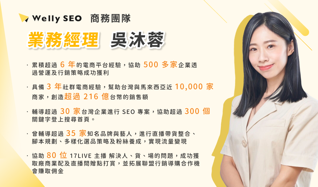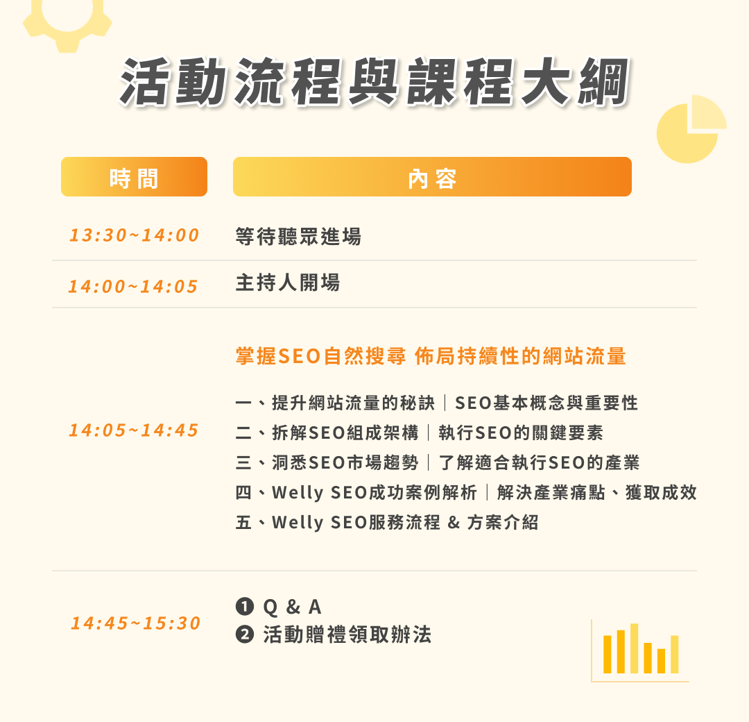 Welly SEO 團隊攜手為你提供最專業的 SEO 指導與支援,邀請你參加這場線上說明會,深入了解 SEO 的基本概念、執行架構與 4 大優化面向。