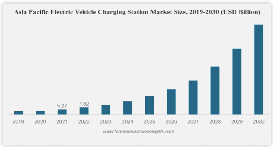 全球充電樁市場將從2023年的16.43億美元飆升至2030年的1410.8億美元。其中亞太地區成長速度最快,全球充電樁複合年成長率預計達36%。(註一)