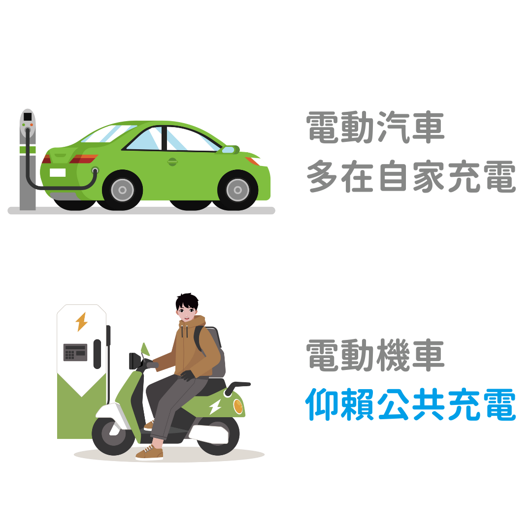根據 Global EV Outlook 2024 的報告指出超過電動汽車超過71~93%的充電行為發生在家中(註二),而非在公眾收費的充電設施充電。然而根據台灣市場現況分析充電式電動機車大部分的充電行為發生在公眾場域的充電樁。(註三)