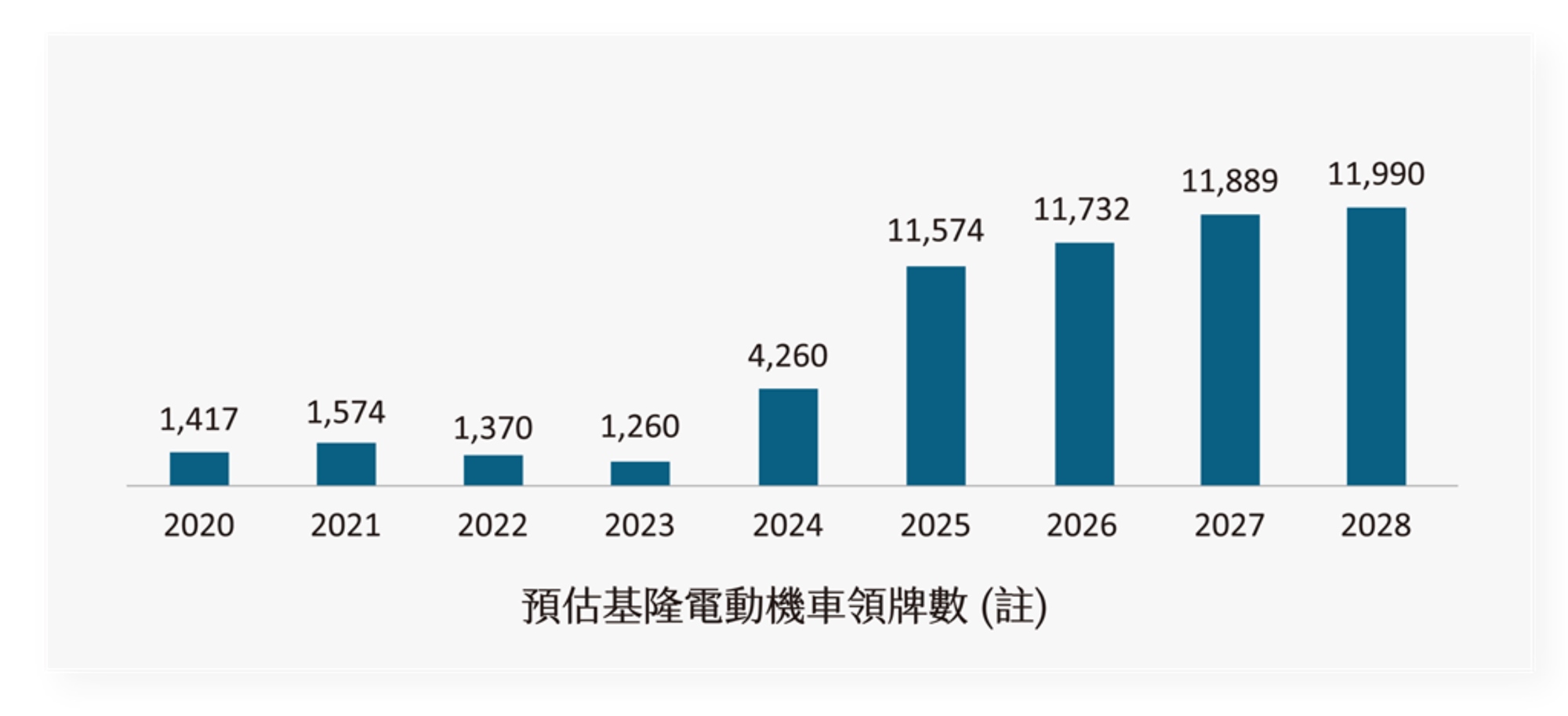 (註四) 預估基隆電動機車領牌數 = 2023年前為全國電動機車領牌數 x (基隆市人口/全國人口) 與 2023年後因基隆電動機車補貼政策微調之預估基隆電動機車領牌數 。