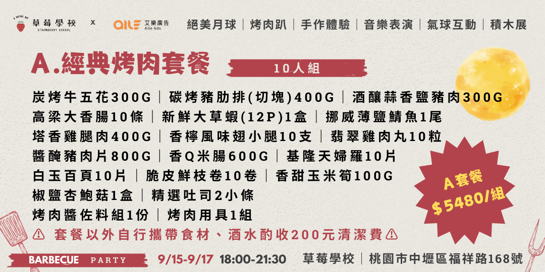 1、經典烤肉套餐:一組$5480元(含10人份食材設備及場地清潔費)