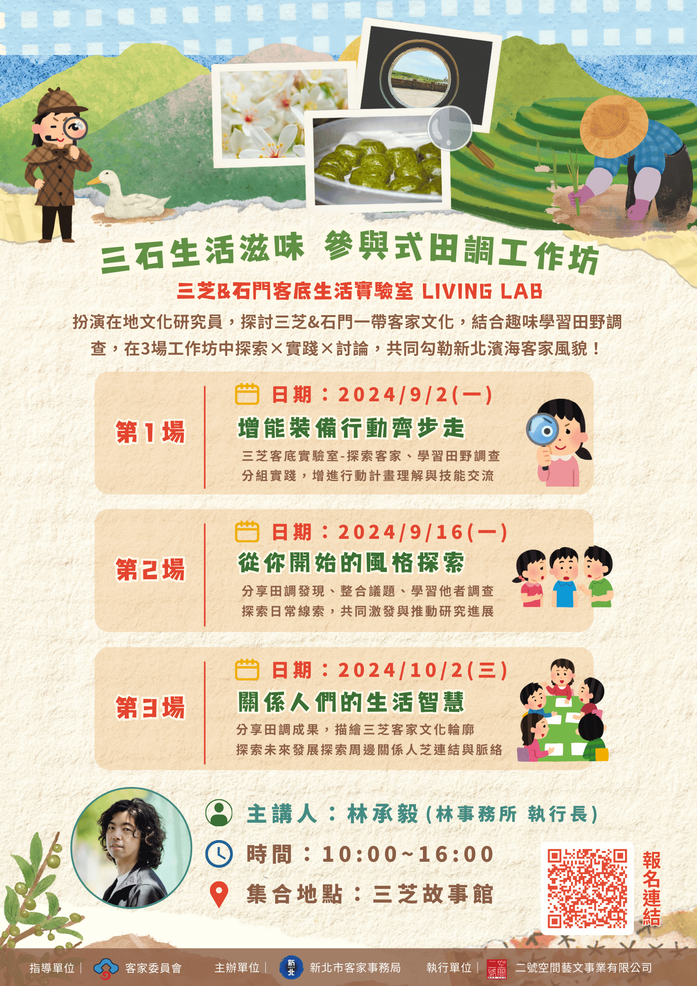 3場系列工作坊將由體驗設計專家,也是地方創生推動者,林承毅老師來擔任講師,透過工作坊的帶領,讓我們一同從參與中來領略文化之美,共同凝聚三芝人的認同,一切就從行動中展展開。參與者將學習可延用至生活中的田野調查技巧,並共同梳理與描繪三石地區客家族群的生活樣貌與文化風情。