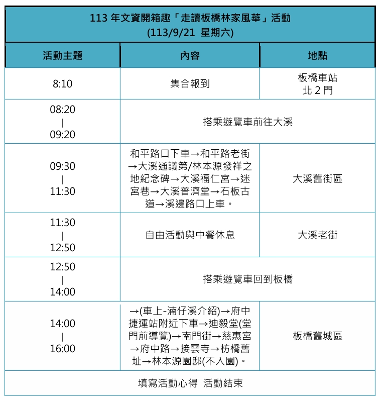 板橋林家於嘉慶與道光年間,因臺北盆地漳泉械鬥不斷,林平侯決定自新莊舉家遷往淡水河上游的桃園大溪,並在此興建「通議第」城池;這座宅第比板橋林家任何建築更早設置,是林家極為重要的發展脈絡,直到20世紀初才被拆毀,現為大溪國小,林家家族後遷至板橋建了枋橋城,間接也促成了板橋地區商業的快速發展,兩地發展皆與林家有著深厚的文化關聯。本次活動藉由一天文化走讀自大溪通議第舊址古城舊址到枋橋古城及四大古廟,瞭解林家歷史發展的脈絡。