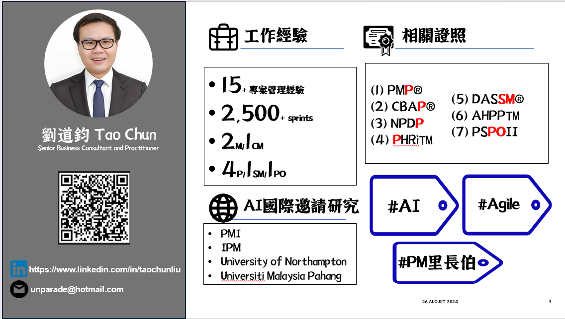 無論你是剛開始進入專案管理領域的新人,還是希望提升自己在業界的競爭力,這門課程都會成為你快速進步的助力。準備好迎接 AI 的挑戰,讓我們一起探索這些酷炫的工具,讓你的專案管理工作更具效率與創造力吧!不僅如此,這門課程還會提供實用的技巧,幫助你打造個人 PM 品牌,成為專案管理領域的耀眼新星。快來加入我們,一起迎接 AI 帶來的專案管理革命吧!