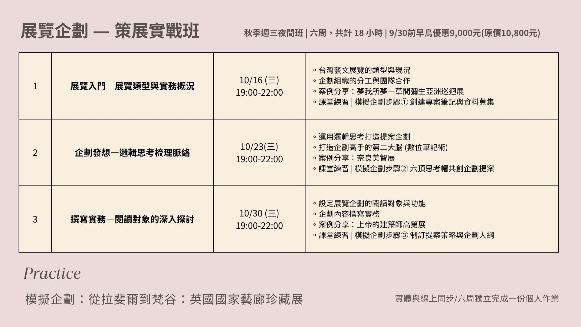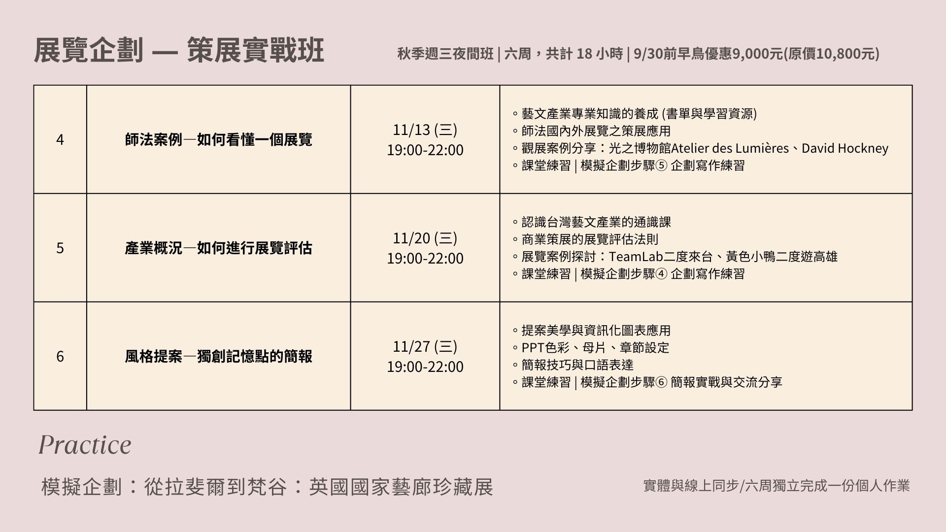 深入瞭解台灣藝文展覽實務,導入邏輯思考進行論述發想與內容撰寫,並進行簡報技巧的演練。18小時呈現「企劃入門」與「策展實戰」的兩套課程之精華:「企劃入門」旨在帶領學員從0到1瞭解藝文產業,並提供產業相關的學習資源與書單;「策展實戰」將會完成一份個人的展覽企劃,今年模擬企劃選擇以奇美博物館「從拉斐爾到梵谷:英國國家藝廊珍藏展」案例來練習實戰,企劃內容包含國際洽談、展覽分區、展示設計、票務規劃、商品設計、宣傳行銷、現場營運等,學員將透過企劃來瞭解展務的工作實境。